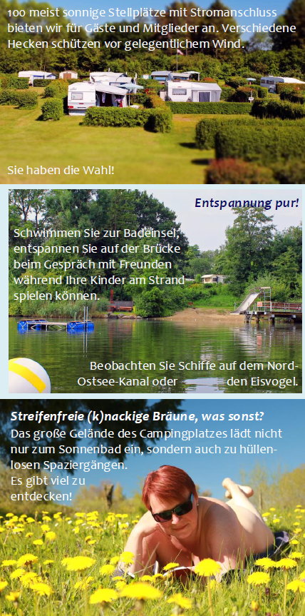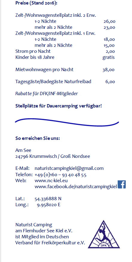 Naturist Camping am Flemhuder See Kiel e.V.Prospekt mit Angaben zu den Stellplätzen für Wohnwagen und Wohnmobile, den Sport- und Spielmöglichkeiten und den Orten der Erholung. Webseite: www.nc-kiel.eu