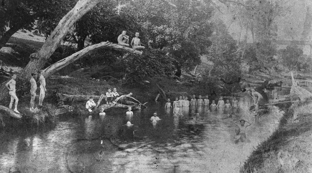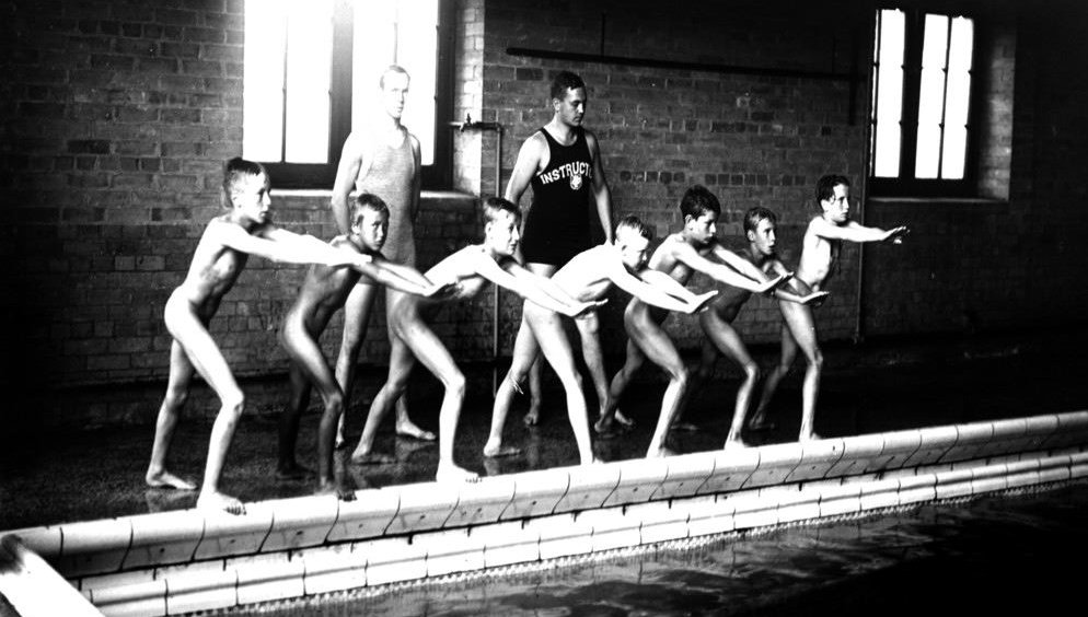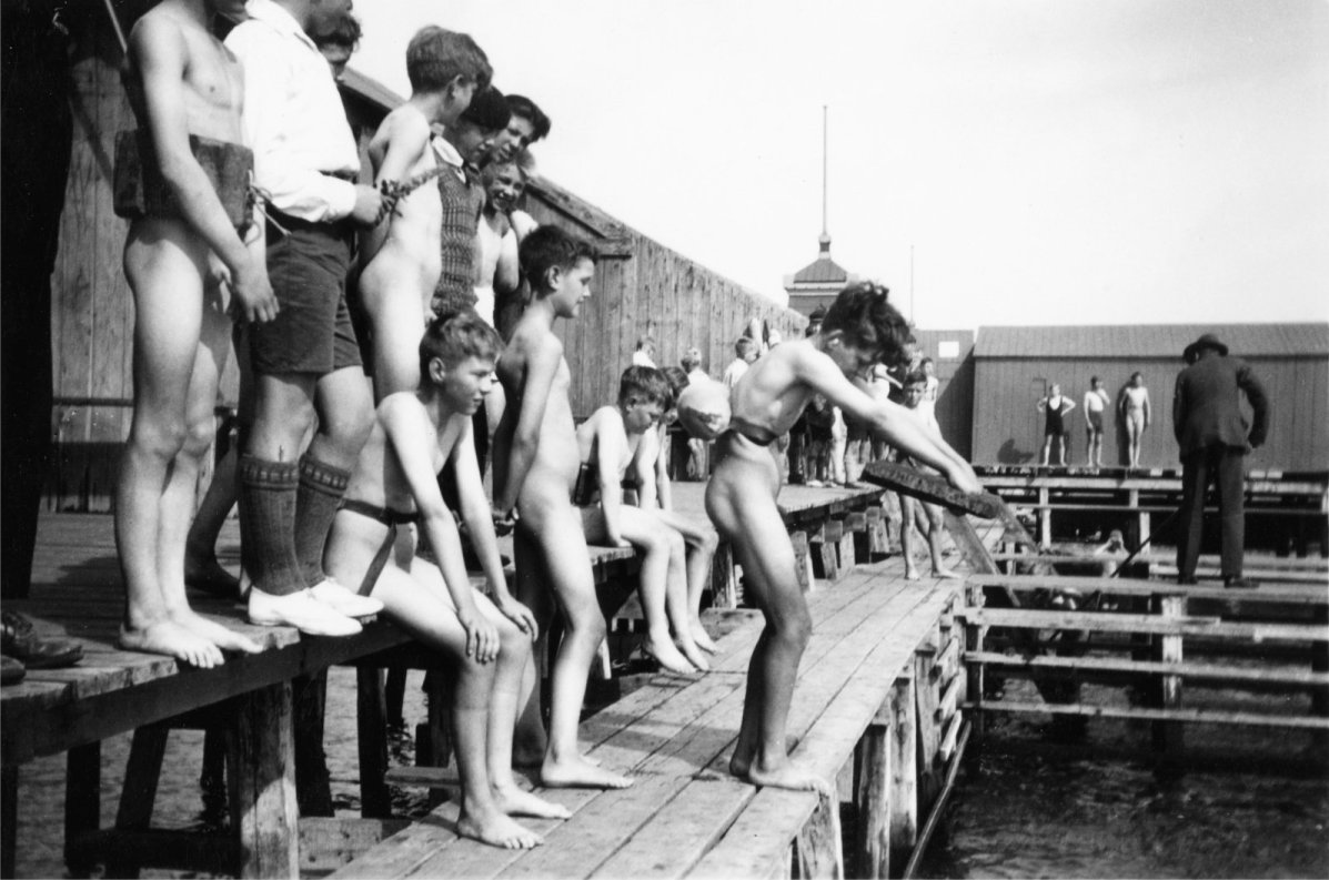 In den Jahren um 1900 wurde der Schwimmunterricht vielerorts unbekleidet durchgeführt. Häufig findet man historische Bilder, auf denen deutlich zu erkennen ist, dass die Jungen nackt in Flüssen, Seen und Badeanstalten planschen und baden. |