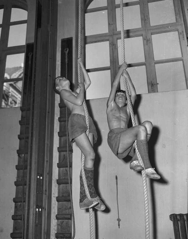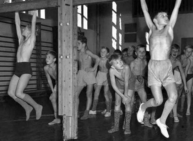 Bei dem weiteren Sportunterricht turnten die Jungen mit bloßem Oberkörper. |