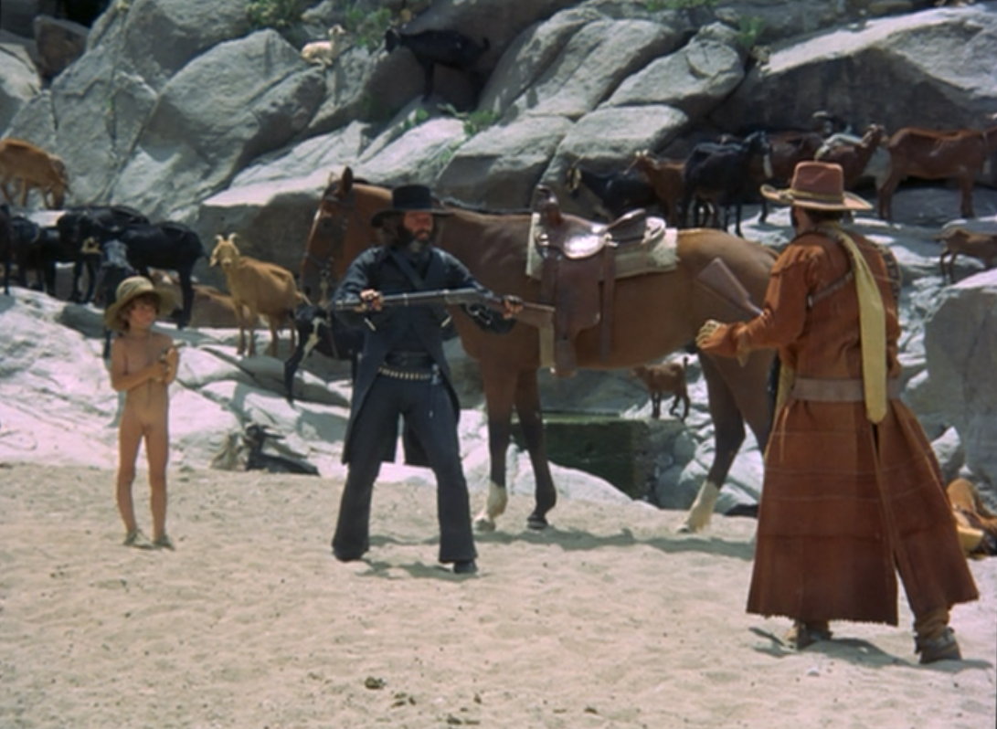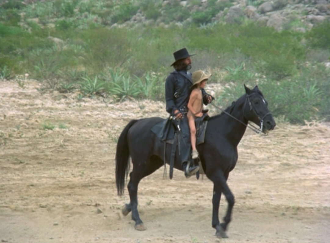 Ein in schwarz gekleideter Kopfgeldjäger und sein nackter Sohn reiten durch die Wüste. Irgendwo in diesem Niemandsland steigen sie ab und knien sich in den Sand. Der Kopfgeldjäger gibt seinem kleinen Jungen eine Puppe und ein gerahmtes Foto und sagt: „Du bist nun sieben Jahre alt, und ein Mann, vergrabe also dein erstes Spielzeug und das Foto deiner Mutter”.