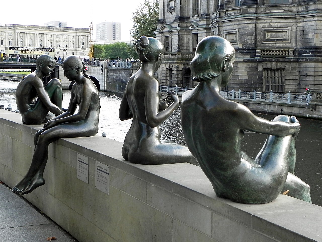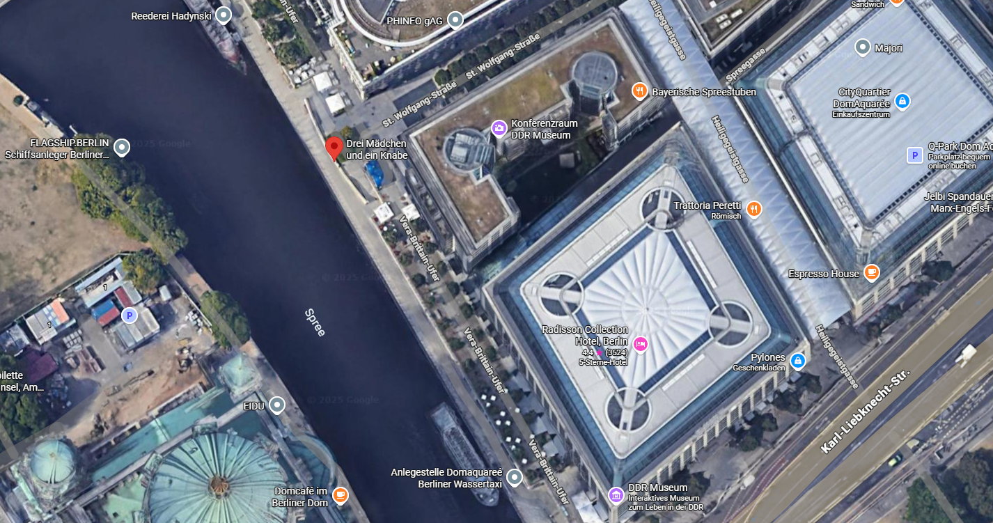 Das Titelbild dieser Ausgabe zeigt die Skulpturengruppe „Drei Mädchen und ein Knabe” des Künstlers Wilfried Fitzenreiter (17.09.1932 - 12.04.2008). Die vier Figuren standen ursprünglich seit 1988 am Brunnen vor dem einstigen Palast- hotel. Auf dem Gelände steht heute das CityQuartier DomAquarée. 2007 wurden sie am Ufer der Spree, schräg gegenüber dem Berliner Dom, aufgestellt. |