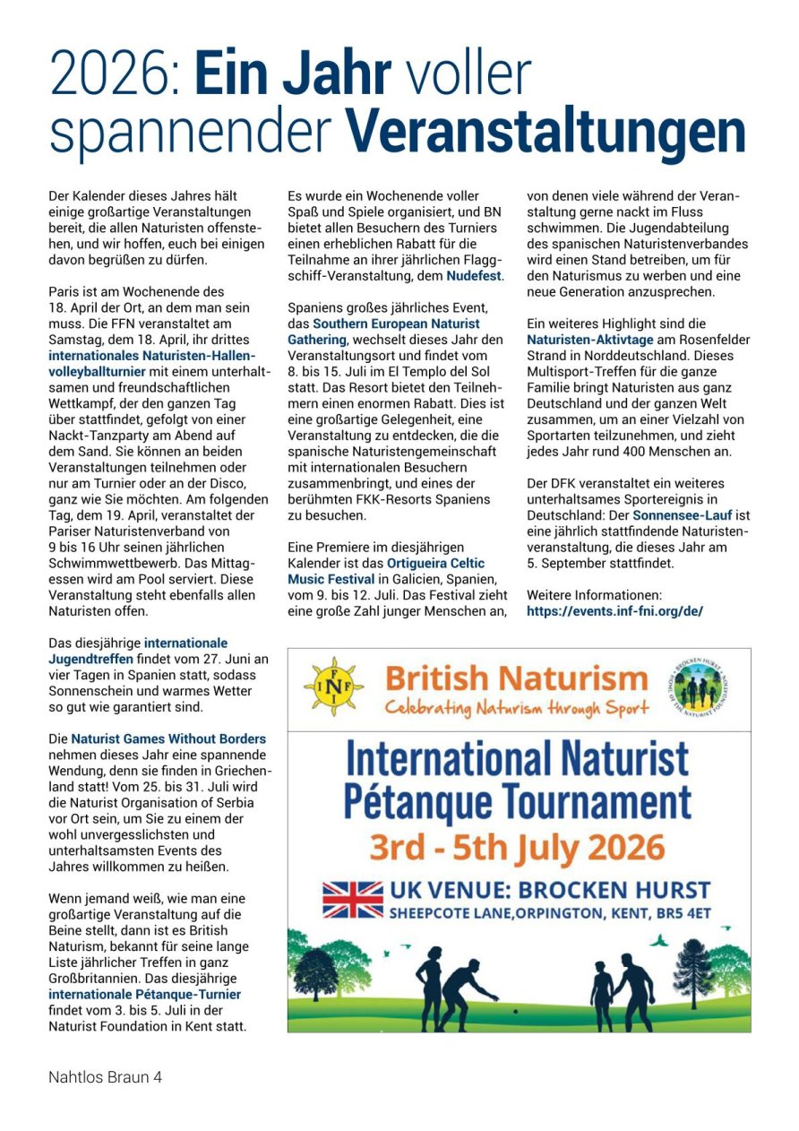 NAHTLOS BRAUNInformationen für NaturistenOffizielles Organ des Österreichischen Naturistenverbandes (ÖNV) Ausgabe 276 • Nr. 1/2026 |