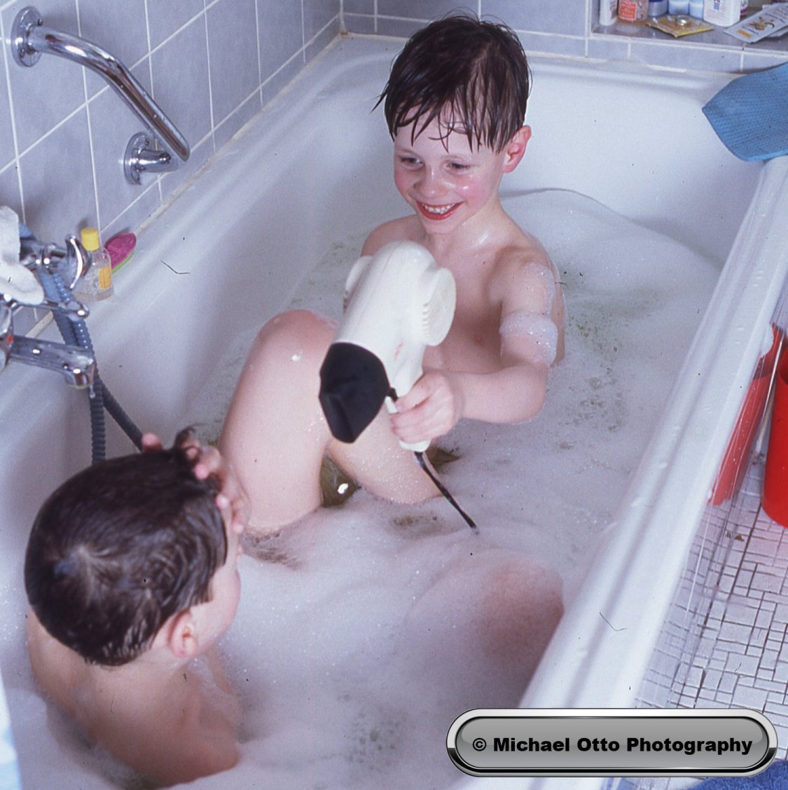 In dem Vorgespräch zu den Aufnahmen wurde den beiden Jungen genau erklärt, wie gefährlich elektrische Geräte sind, wenn sie in die Badewanne fallen. Mit den Aufnahmen wollten wir zeigen, dass man DIES nie so tun sollte !