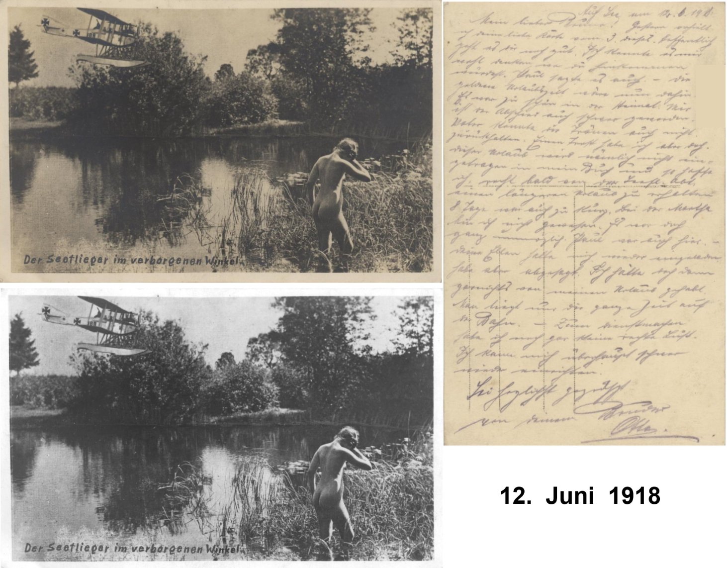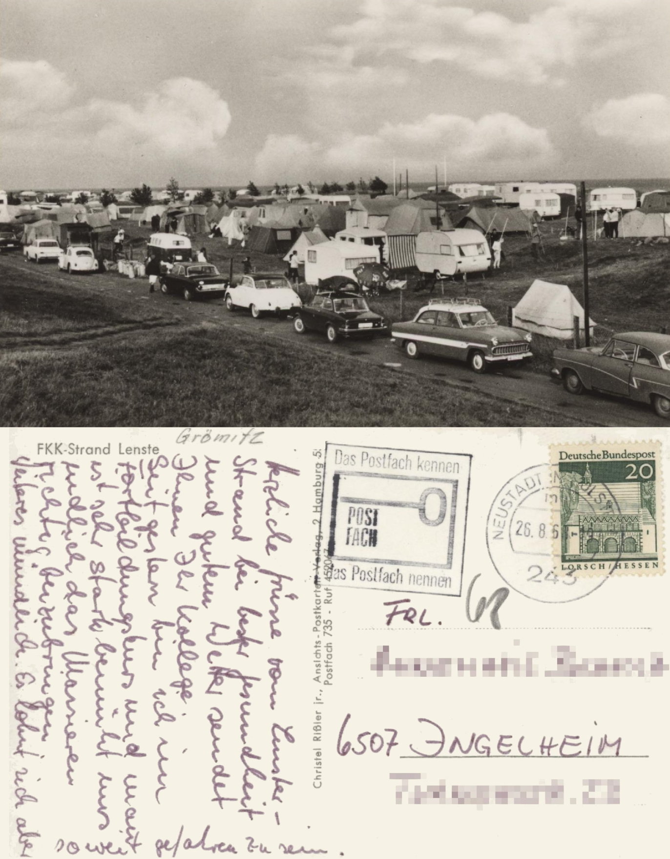 Postkarten, oder aber auch Ansichtskarten genannt, zeigen der Familie und den Freunden zu Hause, wie schön es doch im Urlaub ist. „Unterwegs” macht die Karte auch gleichzeitig noch ein wenig Werbung für das Reiseziel - in unserem Fall sogar auch noch für die Freikörperkultur.