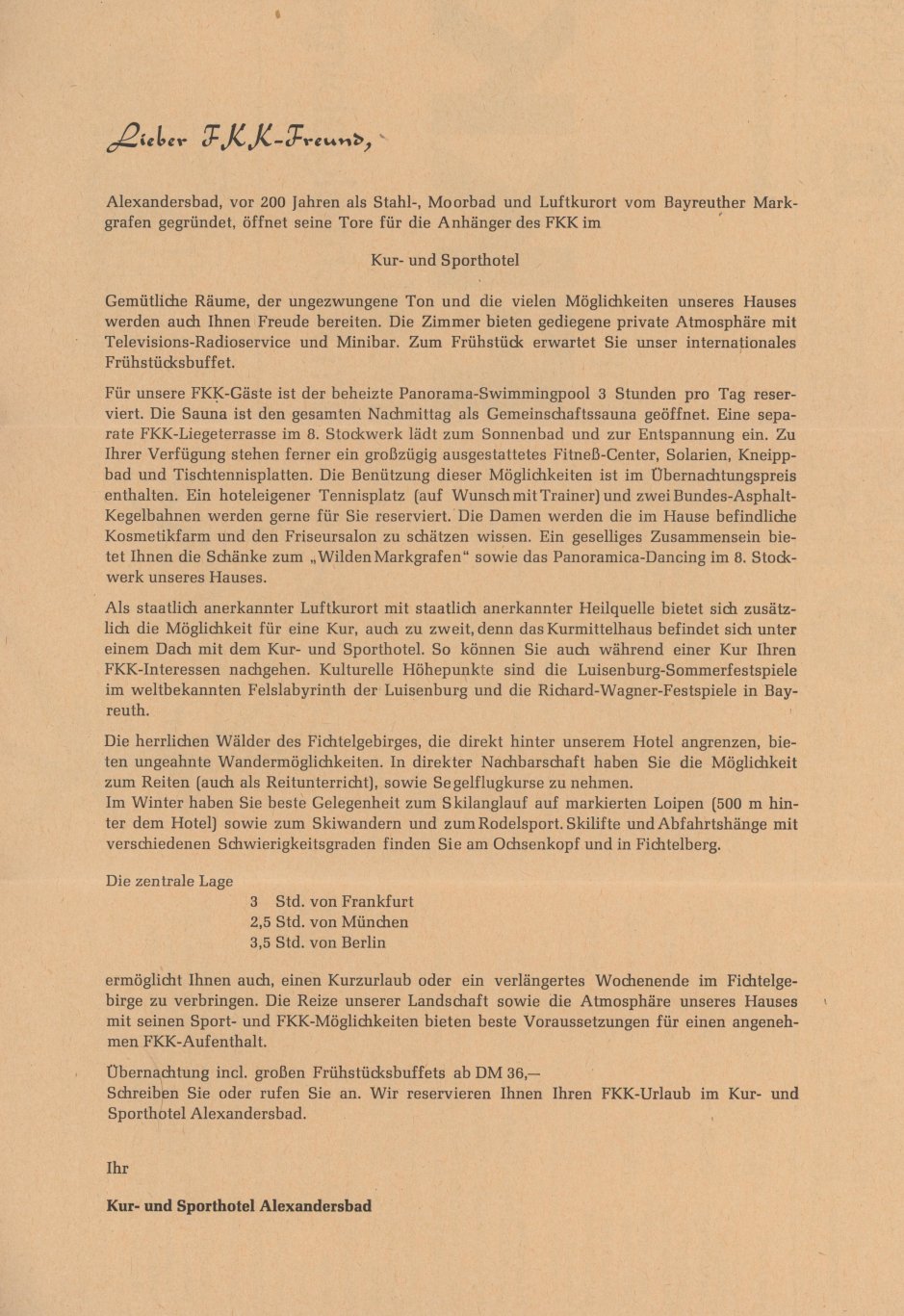 Anfang der 1970er Jahre kommt die große Welt in das kleine Alexandersbad im Fichtelgebirhe. Das Kur- und Sporthotel beherbergt nicht nur Kurgäste, sondern auch Anhänger der Freikörperkultur.