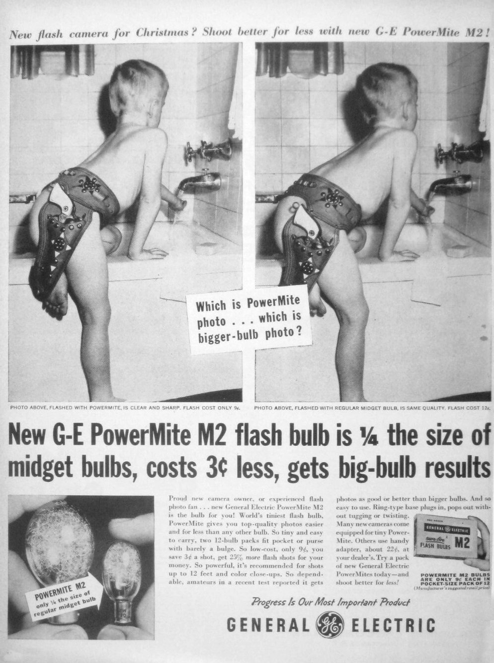 Die G-E Power Mite M2 von General Electric, eine kleine und günstige Blitzbirne verspricht in der Werbung ebenso gute Ergebnisse, wie die herkömmlichen großen Blitzbirnen.