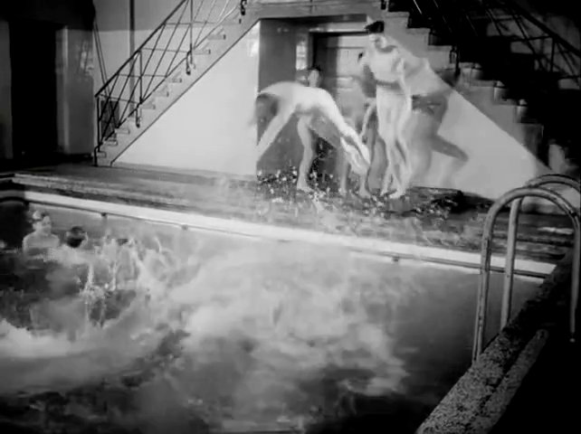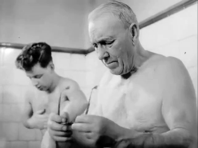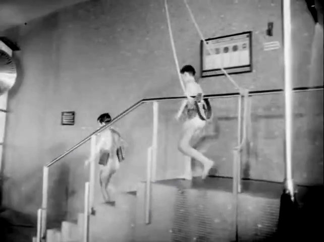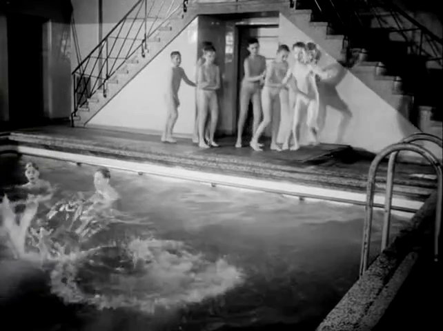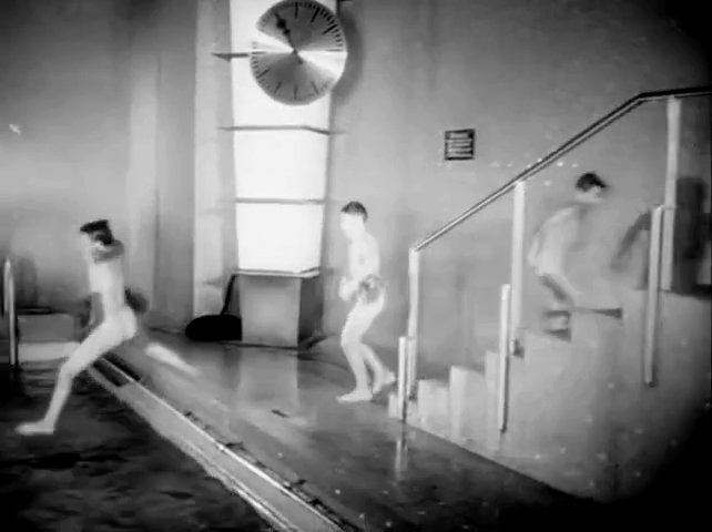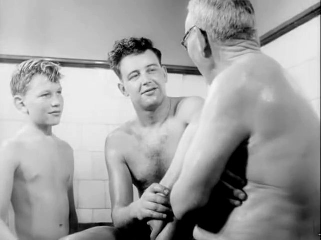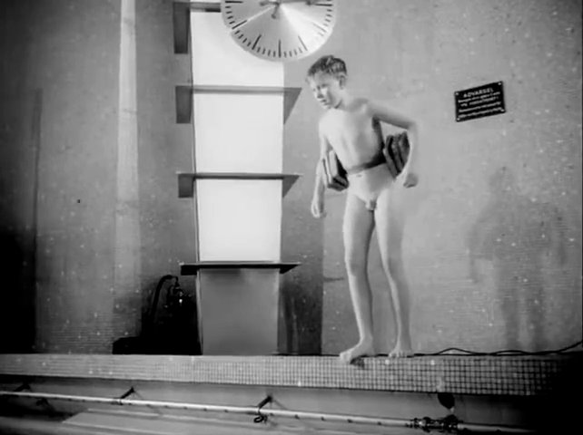 »Byens Bad« Norwegische Filmdokumentation aus dem Jahr 1952. Dauer: ca. 13 Minuten Gezeigt wird das „typische” Volksbad mit Saunabereich und einem groäem Schwimmbecken. Nicht nur ein Freizeit-Spaß, denn hier lernen die Kinder (→ Jungen) auch das Schwimmen. Männer und Jungen waren „unter sich” ... und die Nacktheit war überhaupt kein Problem. |