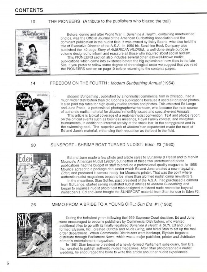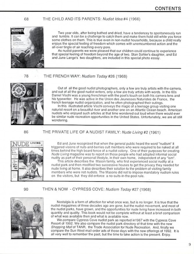 Diese Bücher bieten zu den Nudist-Magazinen der USA einen sehr guten Ein- und Überblick. In erster Linie stellt Ed Lange jene Zeitschriften vor, für welche er auch fotografiert hat - und da er an den FKK-Stränden und in den Vereinen sehr viel in den 50er und 60er Jahren fotografierte, sind das nicht gerade wenig. Ed Lange berichtet aber auch über FKK-Themen, die ihm als Fotografen stets wichtig waren, wie zum Beispiel die Familien, aber auch sportliche Aktivitäten und Wettbewerbe.