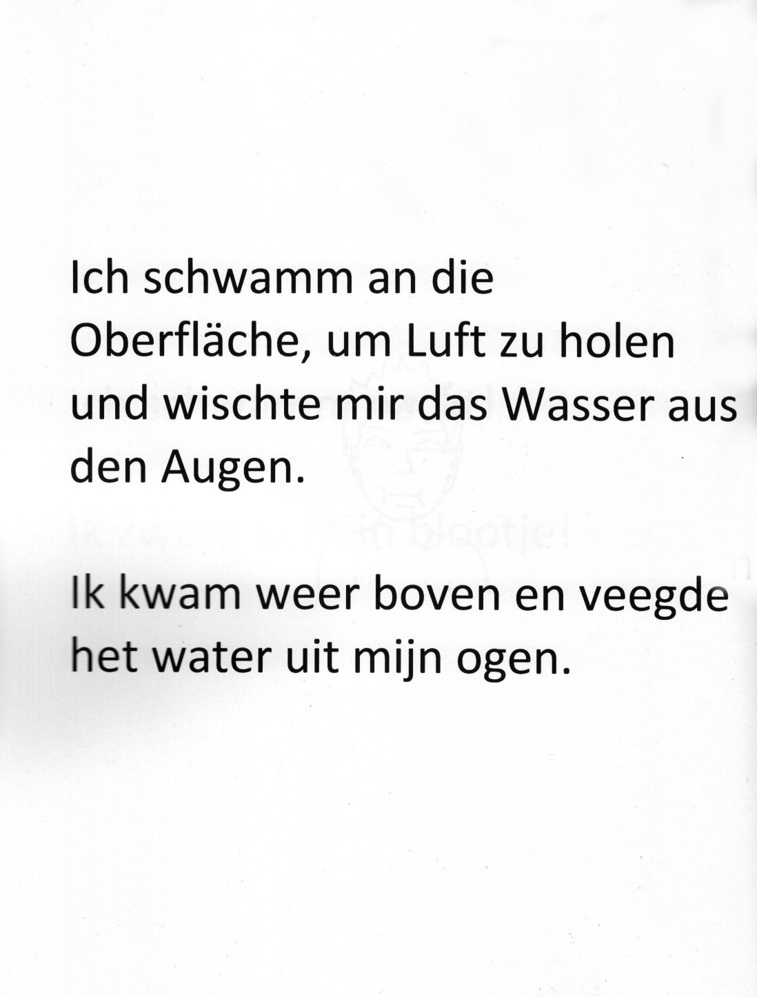 Bei der Bewertung haben wir berücksichtigt, dass der Illustrator Autismus hat - trotzdem, man hätte mehr daraus machen können. Die Texte, bzw. die Sätze kommen ohne viel Fantasie daher und (meines Wissens nach) nicht korrekt übersetzt. Wie auf der Beispielseite zu sehen, wurde „schwamm” mit „kwam” übersetzt, also „kam”. Besser wäre „zwom” gewesen. Weiterhin wurde in diesem Beispiel der Satz auch nicht vollständig übersetzt.
