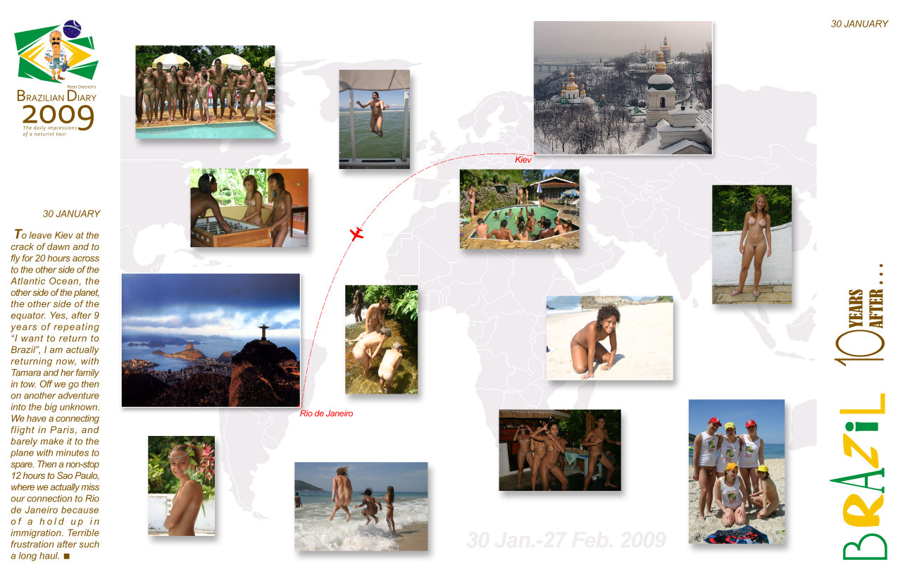 Bereits 1999 besuchte Peter Dietrich für eine Reportage über den Naturismus in Brasilien — 10 Jahre später, 2009, besuchte er erneut Brasilien, dieses Mal für einen Monat und mit einer Gruppe ukrainischer Naturisten. Es entstand ein wunderbares und spannendes Tagebuch mit eindrucksvollen und natürlichen Bildern.