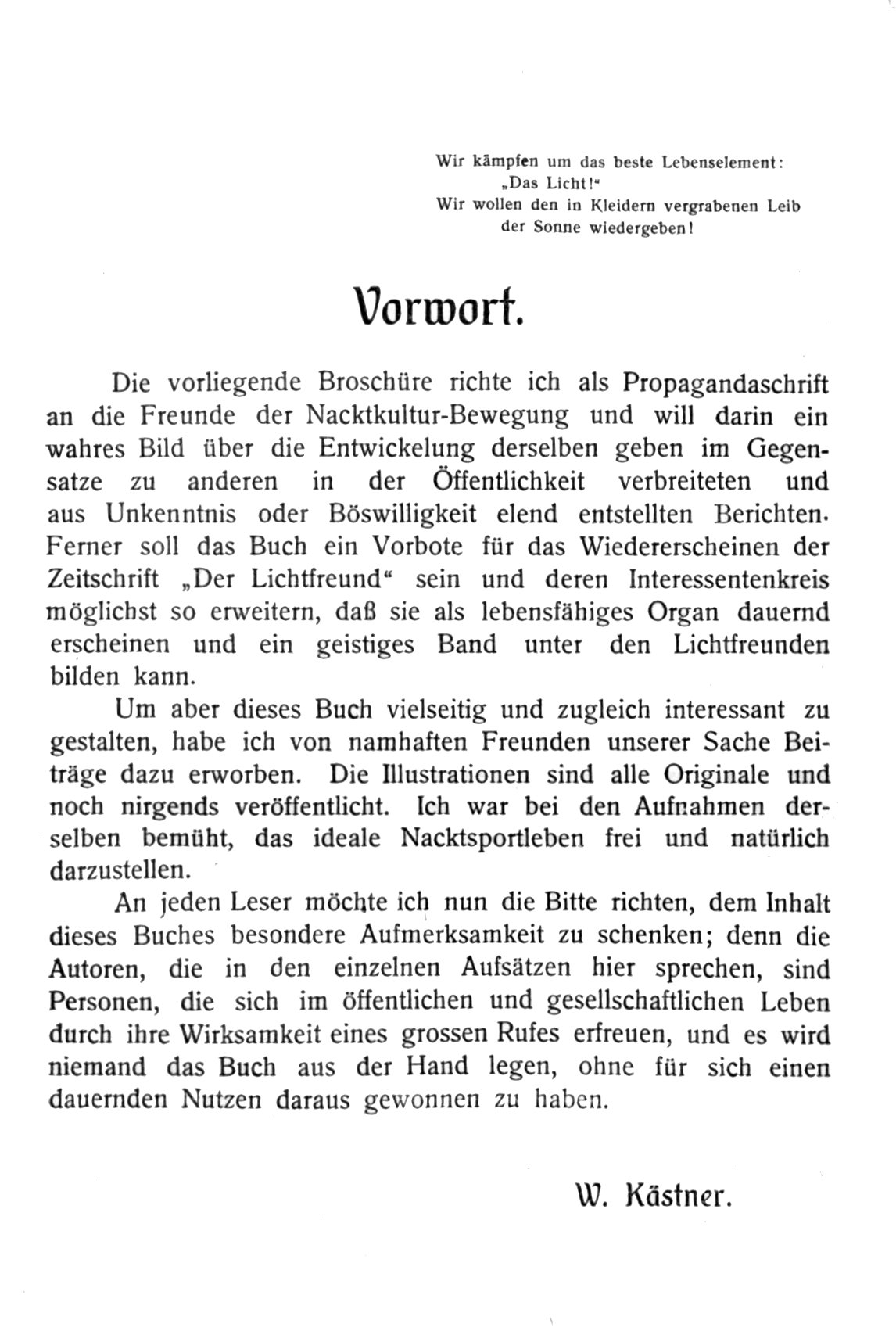 „Benützt eure Freistunden (Anm. → Freizeit), um euch im Kreise Gleichgesinnter nacktsportlich zu betätigen, ihr werdet euch dadurch einer dauernden Gesundheit erfreuen, euer Denken und Sinnen veredeln und euch über alles gemeine Empfinden erheben!”
