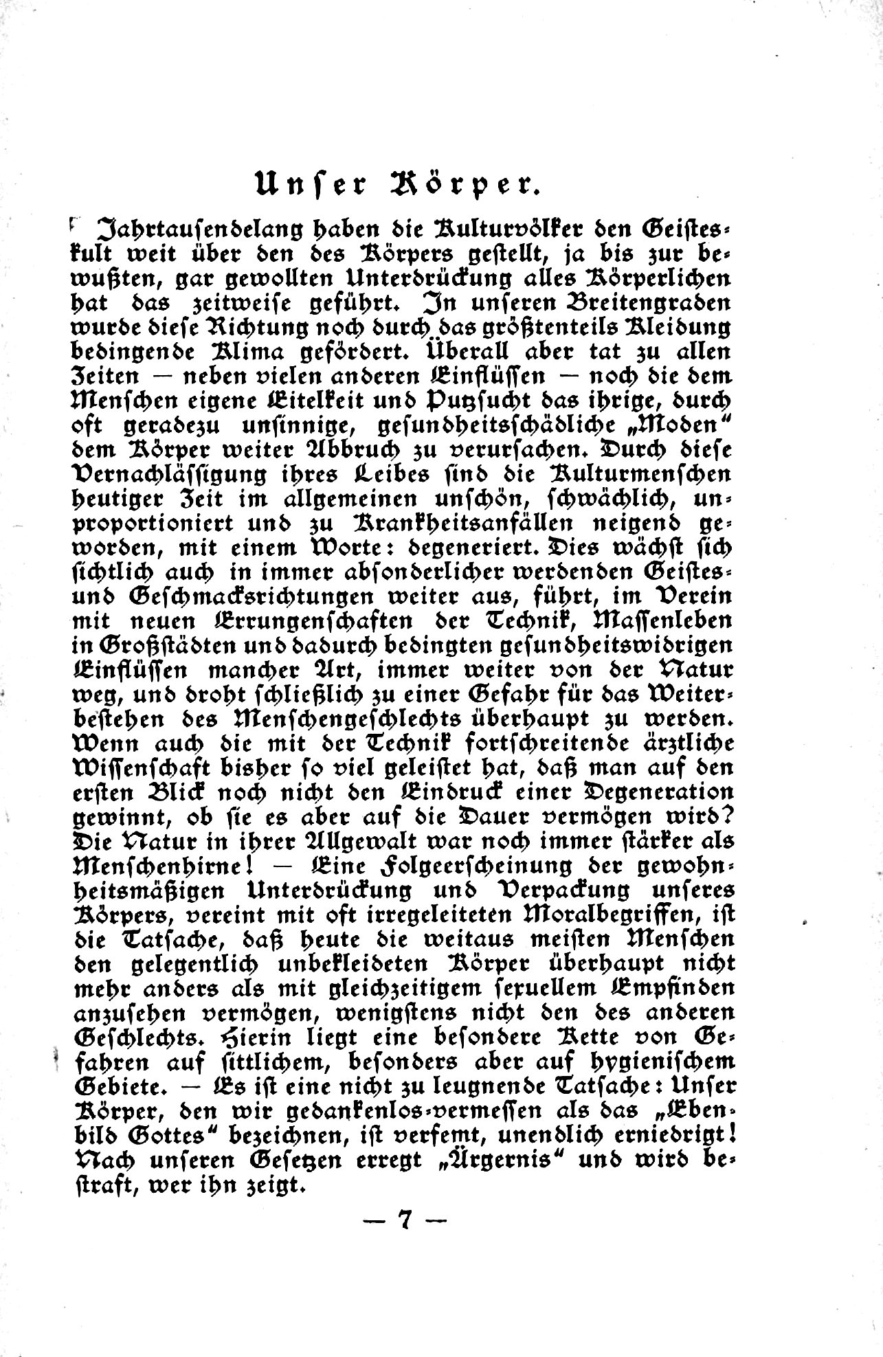 | ☀ Vorwort ☀ Unser Körper ☀ Zweck und Ziele der Freikörperkultur ☀ Hygiene ☀ Lebensreform ☀ Sittlichkeit ☀ Ästhetik ☀ Wesen ☀ Organisation, Vereinsleben ☀ Religion ☀ Familie ☀ Ein Sonnentag ☀ Werktagserholung ☀ Naturschutz ☀ Schlußwort |