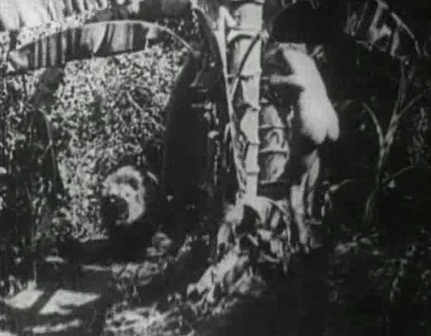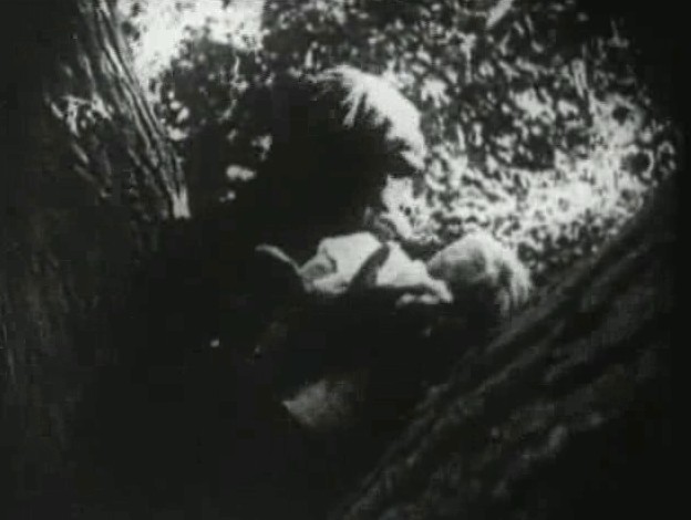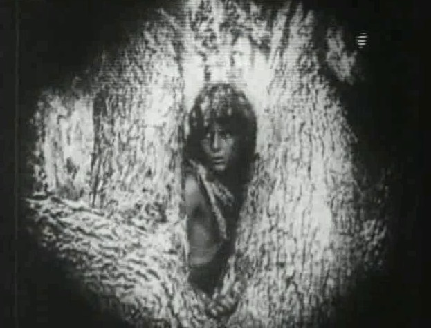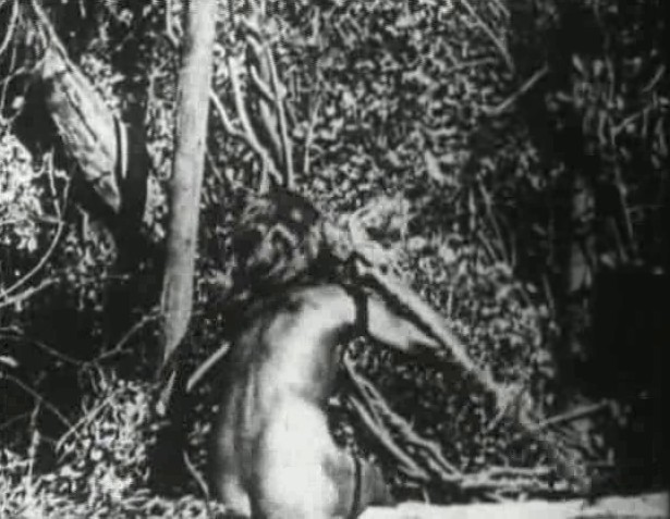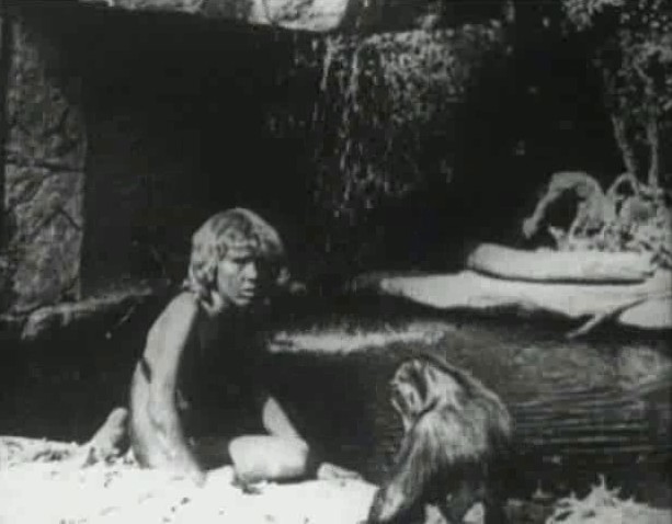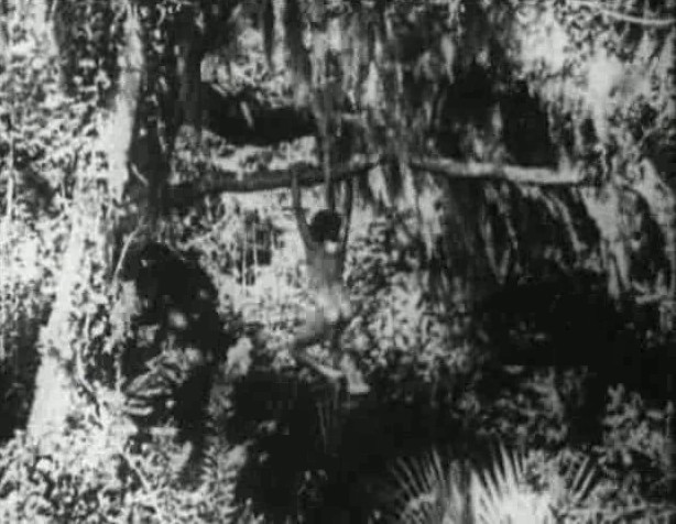 Etwas weiter entfernt, im Dschungel, das Junge der Menschaffen Kala und Kerschak stirbt. Sie hören das Baby von Lord Grystoke schreien, entführen und ziehen es auf. Der Junge (Gordon Griffith) wächst - ohne Kontakt zu anderen Menschen - bei den Affen auf. Es bleibt ihm natürlich nicht verborgen, dass er »anders« ist, als wie seine „Zieh-Eltern”. Eines Tages entdeckt er ein kleines Dorf und er bemerkt, dass die Eingeborenen einen Lendenschurz tragen. Der junge Tarzan wartet nun einen guten Moment ab, wo zwei Jungen im Fluss baden wollen und ihren Lendenschurz ablegen, um davon dann einen zu stehlen.
