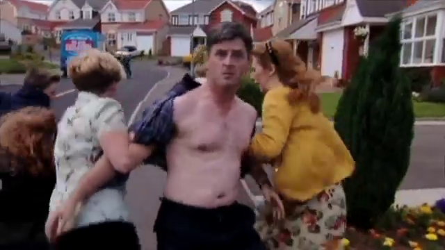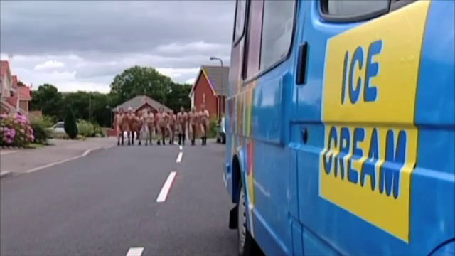 Für den Eis-Verkäufer kommt allerdings jede Hilfe zu spät, obwohl auch er noch versucht, sich selbst zu retten, schafft er das aber nicht. Nackt springt er aus seinem Eis-Wagen und schließt sich den nackten Männern an - nun singen sie: „ten naked men, just walking down the road”...