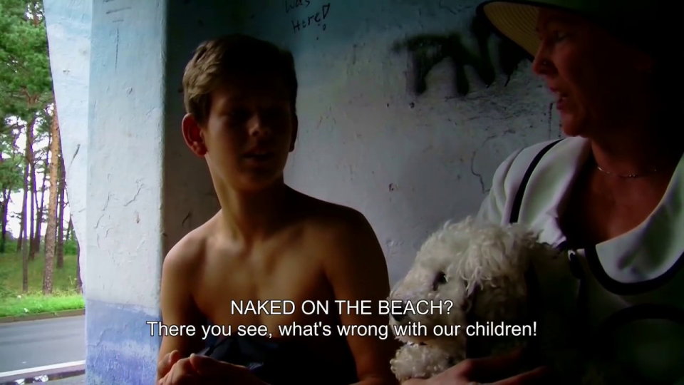 Nun ist Peter gezwungen, den Heimweg nackt anzutreten, was in seinem Fall bedeutet, dass er auch den Bus nehmen muss. Zunächst ist er an der Bushaltestelle ganz allein, was sich aber schnell ändert, dabei kommt es zu interessanten (kurzen) Gesprächen, die mehr aus Vorwürfen und Verteidigungen bestehen und die Bushaltestelle (um Peter und seine Nacktheit) in zwei Lager spaltet.