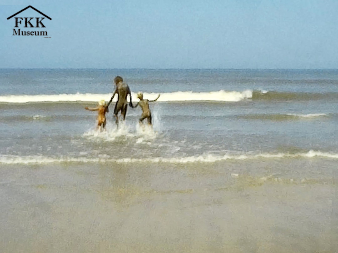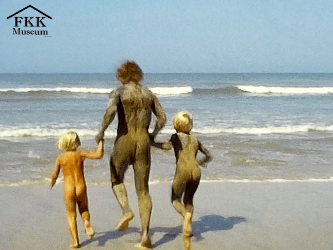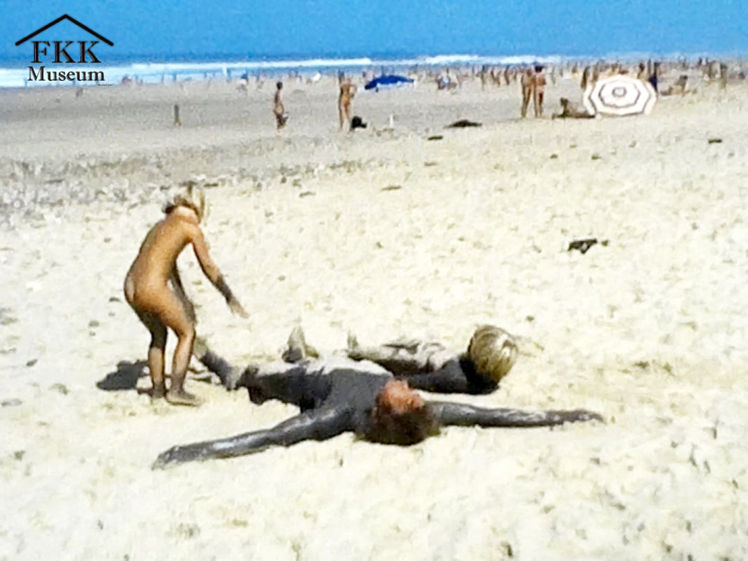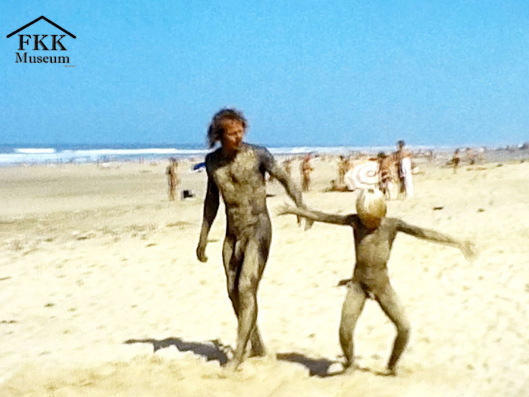 und Erhard Hagebeuker (ehemaliger Bundesvorsitzender der fkk-jugend e.V.) mit ihren Kindern bei der Körperbemalung mit Tonschlick und Sand im Centre