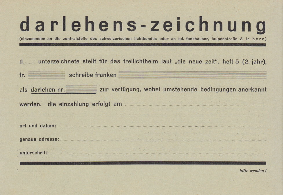 Ein Formular zur Gewährung eines Darlehens war diesem Heft beigelegt. Mit dem Darlehen sollten genügend Geldmittel zusammenkommen, um den Bau eines Vereins- heimes (Freilichtheim) zu finanzieren. |