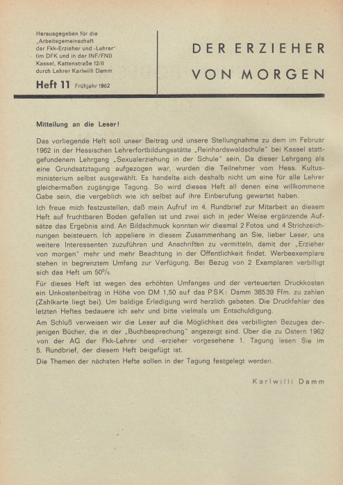 - Mitteilung an die Leser! - Umrisse einer integralen Sexualpädagogik - Gedanken zur geschlechtlichen Erziehung in der Schule - Wer soll den schwarzen Peter behalten, die Schule oder die Eltern? - Der Zankapfel: Frühaufklä,rung - Das Anliegen der FKK-Erzieher - Vorschläge für Richtlinien zur geschlechtlichen Erziehung an den Schulen - Empfehlenswerte Literatur - Buchbesprechungen |