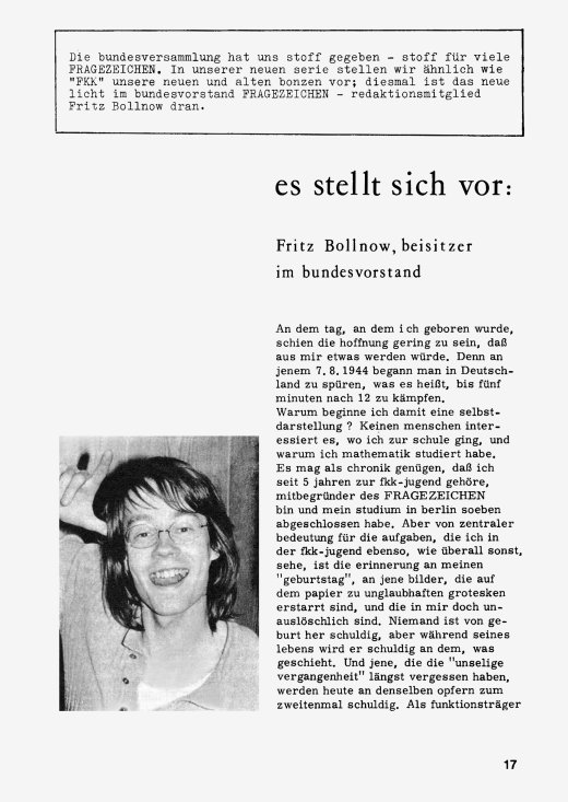 Fragezeichen Fragezeichen ist eine Zeitschrift der fkk-jugend Ausgabe 2 - 1971 Redaktion:Ort:Verantwortung:Herausgeber:Erscheinungsweise:Format:Seiten:Auflage:Titelbild: fkk-jugendBielefeldFritz BollnowFrank Bielka~14,7 x 20,7 cm52- keine Angabe -Michael Röhr Seitenbeispiele: Inhalt: Inhalt / Impressum Friede Freude sport und politik Wie progressiv ist die fkk-jugend ? am deutschen wesen soll die inf genesen INF contra DFK 1. naturisten-welttag → 20. Juni 1971 es stellt sich vor: Fritz Bollnow, beisitzer im bundesvorstand Ferien vom Ich - Osterskilager 71 Buäääh contra Bla-Bla auf der (mittelberg-)alm, da gibt's ka..... Ö,ffentlicher FKK-Strand in Berlin Comic FKK an der Havel News Wie schön ist's funktionär zu sein bisher unveröffentlichte schätze aus dem »ruf«-nachlaß versackt / Bindestrich Der Mey der Mey Und immer wieder Summerhill der ruf / junge linke