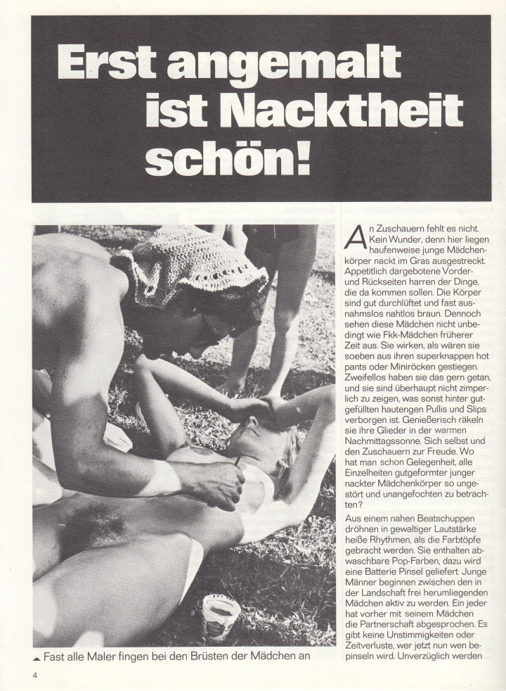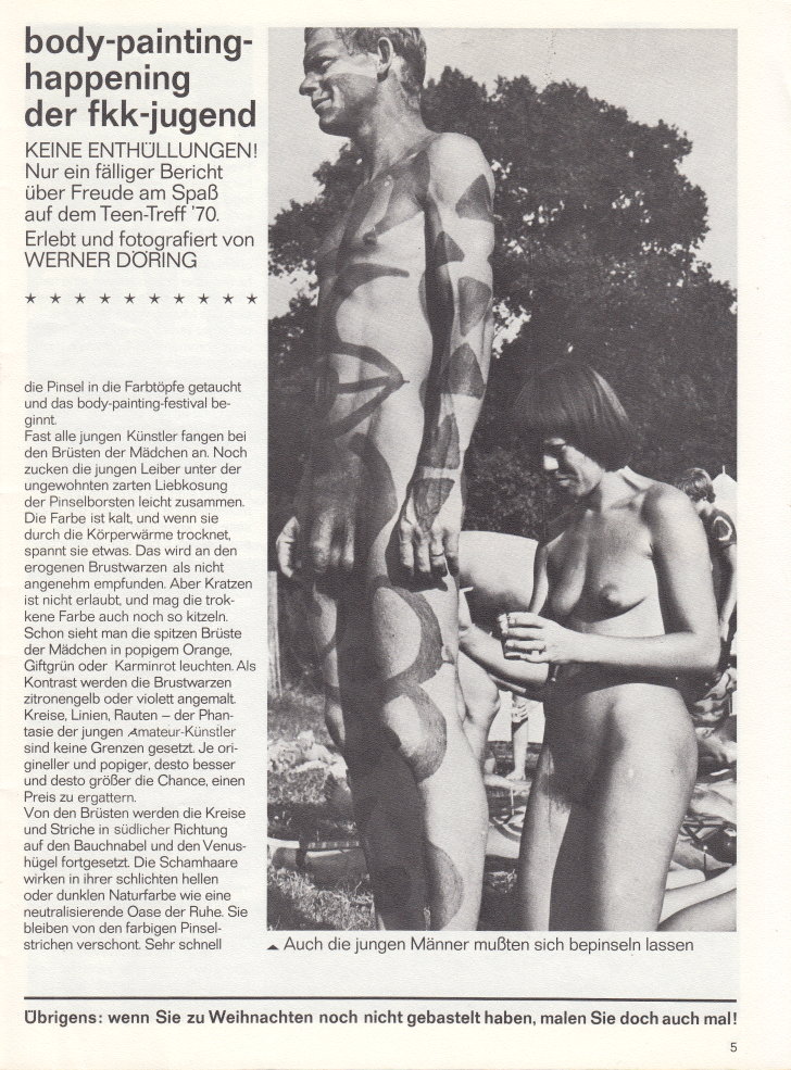 | body-painting-happening der fkk-jugend Das Bild zeigt den späteren Bundesvorsitzenden der fkk-jugend e.V. Erhard Hagebeuker auf dem Teen-Treff '70, wie er gerade von seiner Frau Ursel küstlerisch „verziert” wird. |