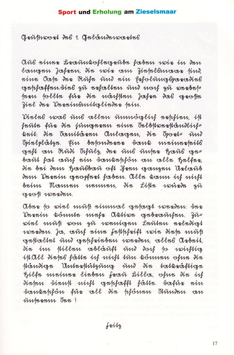 Interessant auch das Grußwort von Fritz, dem 1. Geländewart, geschrieben in Sütterlin ... und für alle, die dieses Grußwort nicht lesen können, gibt es eine Seite weiter dann die Übersetzung.
