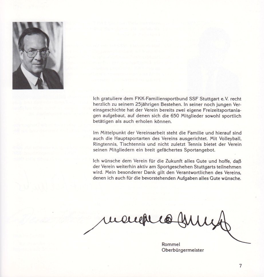 Grußworte des Oberbürgermeisters Manfred Rommel, Helmut Sickmüller (Bürgermeisters der Gemeinde Wurmnberg), Werner Schüle (1. Vorsitzender des Sportkreises Stuttgart), Karl Dreßen (1. Vizepräsident der INF), Detlef Schrader (Präsident des DFK), Kurt Lörcher (1. Vorsitzender des LV Südwest e.V.) und Siegrid Bornemann (1. Vorsitzende) leiten die Broschüre ein, gefolgt von der Chronik und Erinnerungen.
