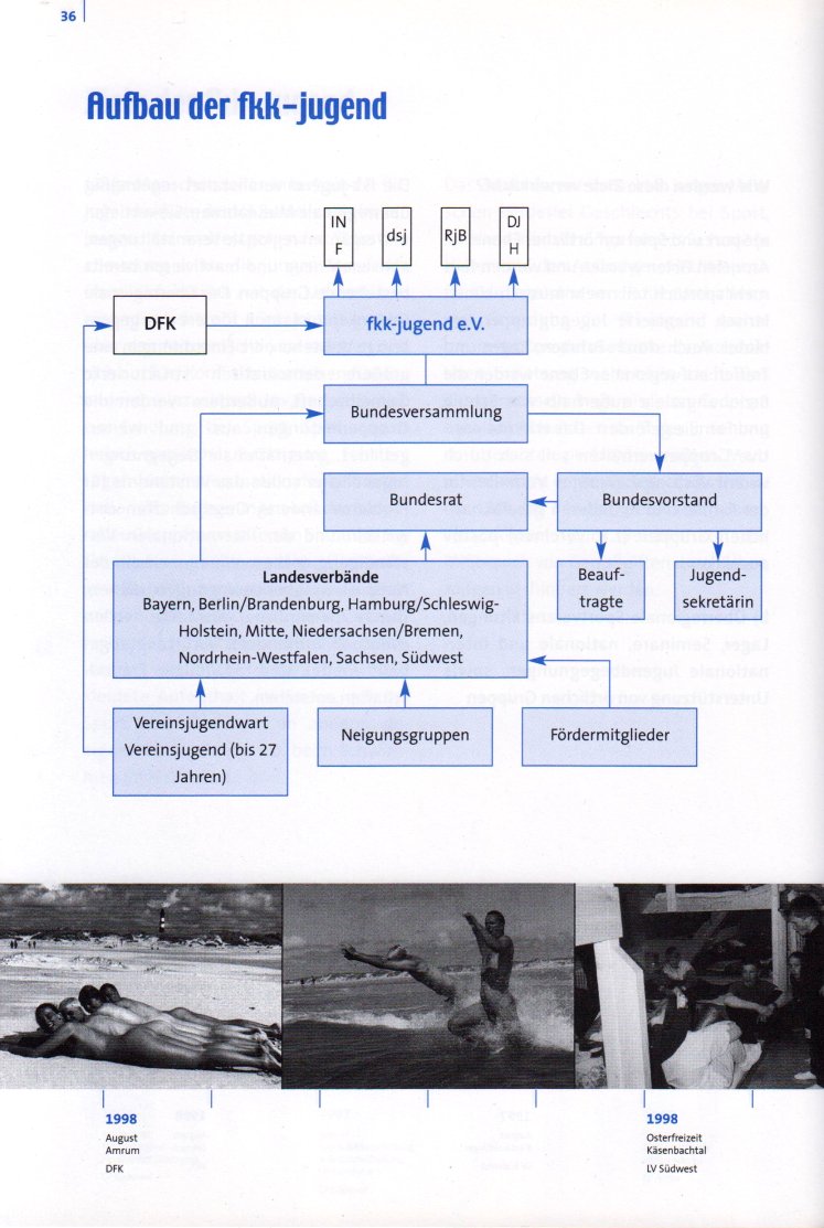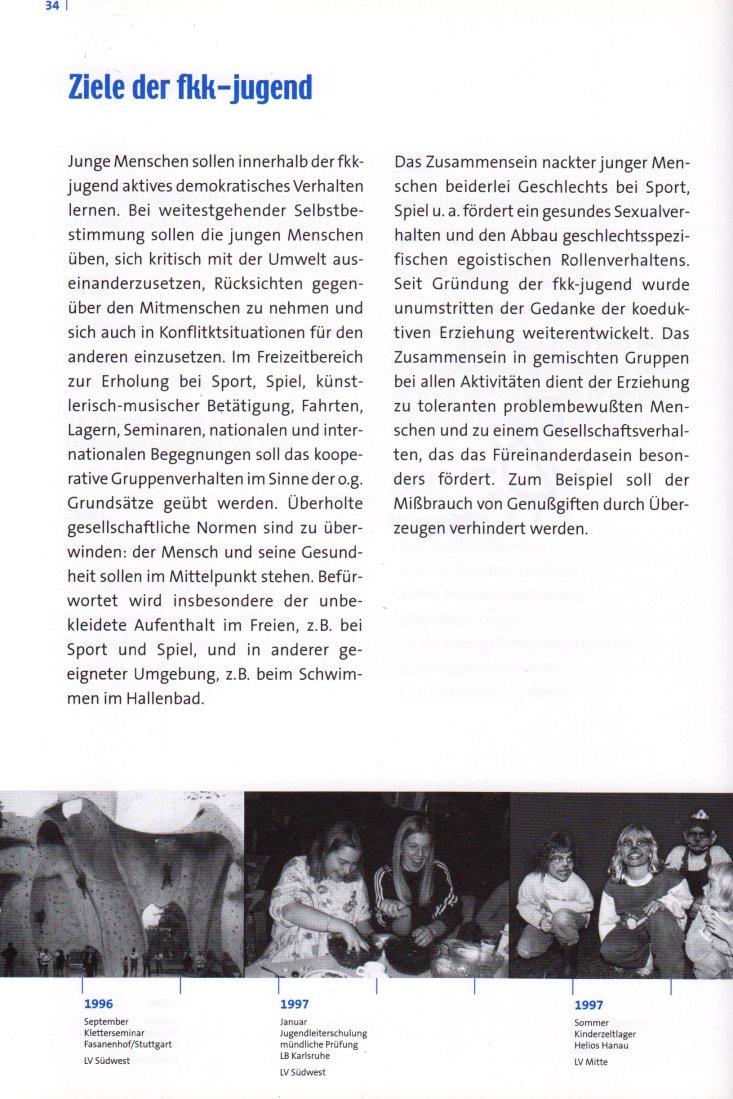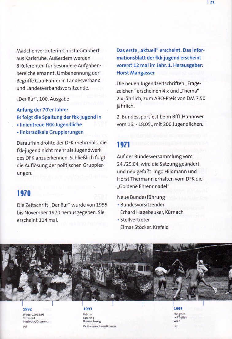 Sehr informatives Jubiläums-Heft mit einer ausführlichen Chronik. Erwähnenswert ist die im Heft durchgehende „Zeitleiste” mit Bildern und Kurzbeschreibungen zu den jeweils wichtigsten Ereignissen der fkk-jugend (Sommerlager, Ferienfahrten, Treffen, usw.).