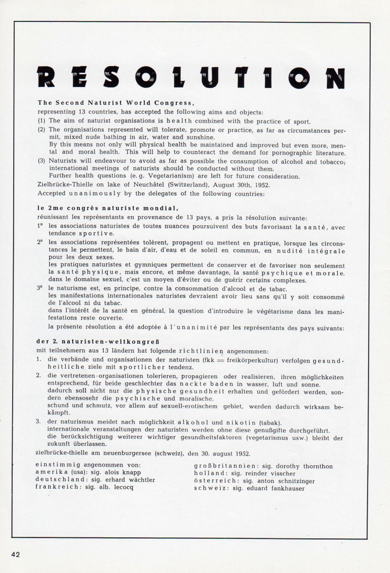 | Nach ersten Kontakten lud der „Orplid” zu einem internationalen Treffen nach Frankfurt am Main ein. Hier beschloß man bereits, einen „Europäischen Freikörperkulturbund” zu schaffen. Der 2. Weltkrieg kam dazwischen Die INF/FNI wurde dann 1953 gegründet. Diese Broschüre erinnert an die langfristige und gute Zusammenarbeit, welche bereits vor dem Krieg bestand. |