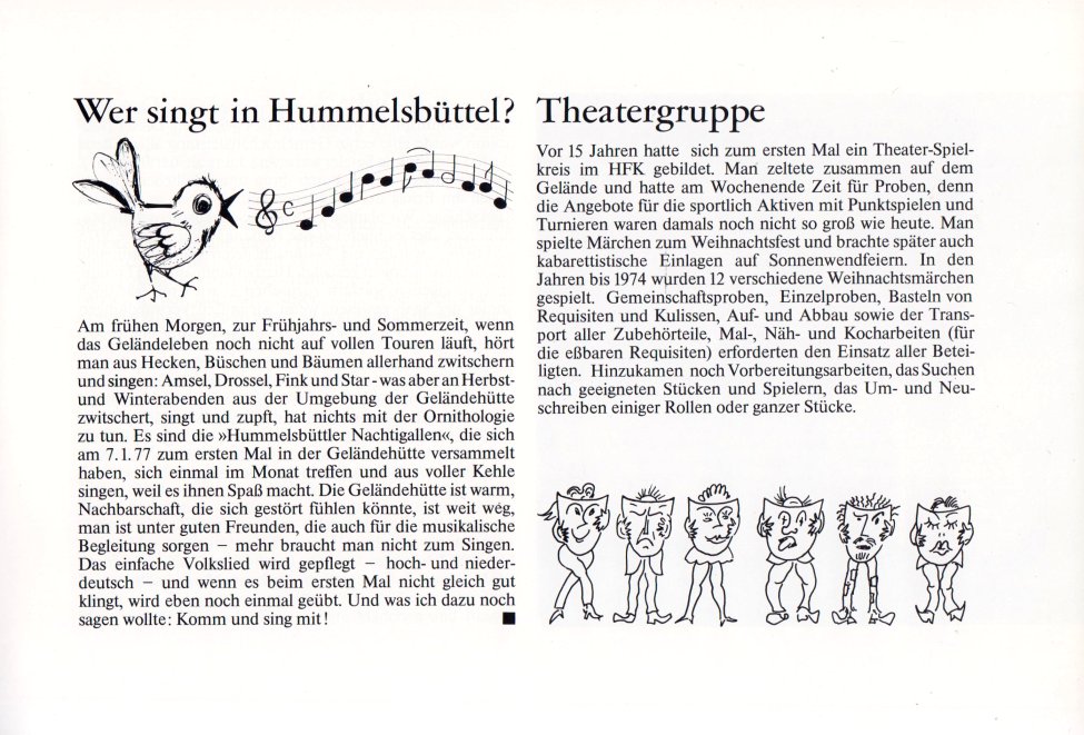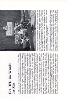 | Mit Grußworten und Glückwünschen des ersten Bürgermeisters Hans-Ulrich Klose, dem 1. Vorsitzenden des Hamburger Sport-Bundes, Herrn Fritz Bauer und des DFK-Präsidenten, Herrn Rudolf Emmel. Einleitende Worte zum Jubiläum von Herrn Jochen Kipker, dem 1. Vorsitzenden des HFK. Mit zahlreichen Bildern wird die Entwicklung des HFK ¹ mit seinen damaligen Außenstellen ² und Untergruppen ³ seit 1953 dokumentiert und die ehemaligen ersten Vorsitzenden des Vereines vorgestellt. Es wird beschrieben, wie die Freizeit- und Sportangebote kontinuierlich ausgebaut und 1969 erstmals ein »Tag der offenen Tür« veranstaltet wurde. Unter dem Motto »Familienfreizeit in Sonne und Luft« hatte der HFK einen eigenen Info-Stand auf der Verbrauchermesse »Du und Deine Welt«. |
