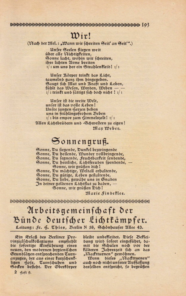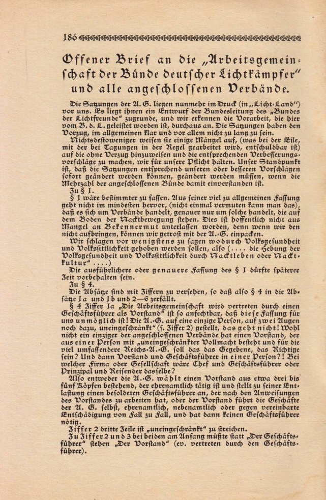 | Streitigkeiten zwischen den einzelnen Bünden bilden in dieser Ausgabe noch den Schwerpunkt. Wesentlich ging es bei diesen Unstimmigkeiten um die Satzungen und eben darum, dass diese Streitigkeiten stets in Leserbriefen über und durch die Zeitschrift »Licht-Land« ausgetragen wurden. Das Heft kam mit zwei Bildern aus der Bewegung aus. |