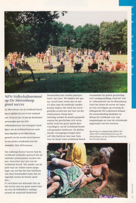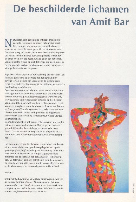 | • Interview mit Jan Meere, Vorsitzender der NFN, über den Naturismus in den Niederlanden. • Zwanger - Schwangerschaft und FKK, über die Schönheit schwangerer Frauen. • 4-seitiger Bildbericht über die vergängliche Körperkunst von Amit Bar |