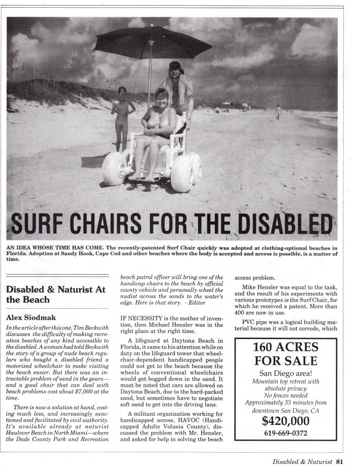 | Titelbild: Das Titelbild hat Lee Baxandall bei den Trafalgar Falls aufgenommen. Disabled & Naturist Schwerpunktthema dieser Ausgabe sind Themen rund um behinderte Nudisten. Auf über 20 Seiten (!) widmet sich die Redaktion den unterschiedlichen Behinderungen und wie man mit ihnen in den Vereinen und an den Stränden umgeht. Ausführlich wird der Rollstuhl für Strände vorgestellt. Mit seinen breiten Reifen kommt er sogar an einem Sandstrand gut voran. Er ist in einer Leichtbauweise gearbeitet und auseinandergenommen findet er auch in einem Auto-Kofferraum Platz. |