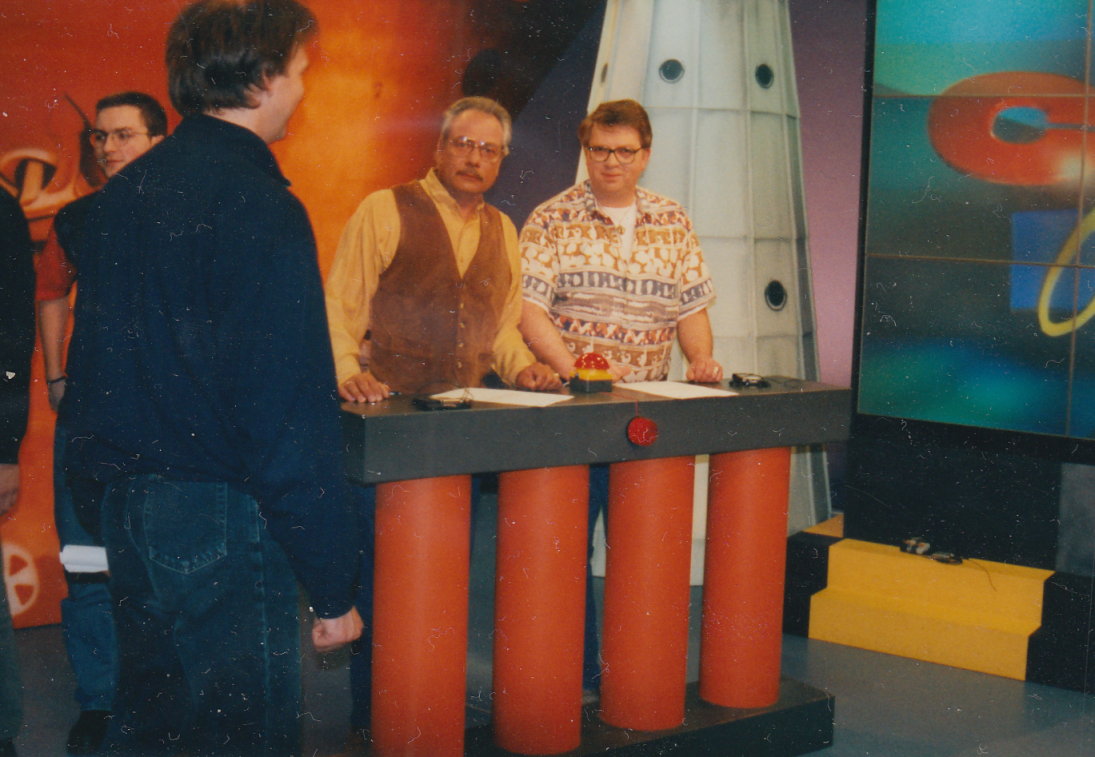 Ferdinand und ich am Rate-Pult Ferdinand, ich, Quizmaster Ermo Gödelt,
