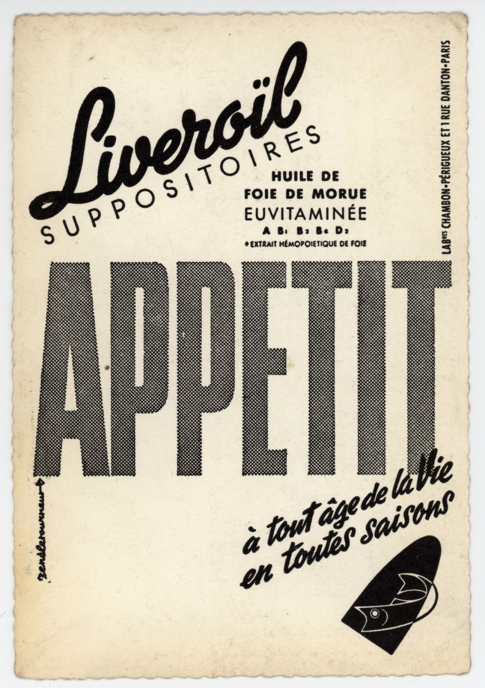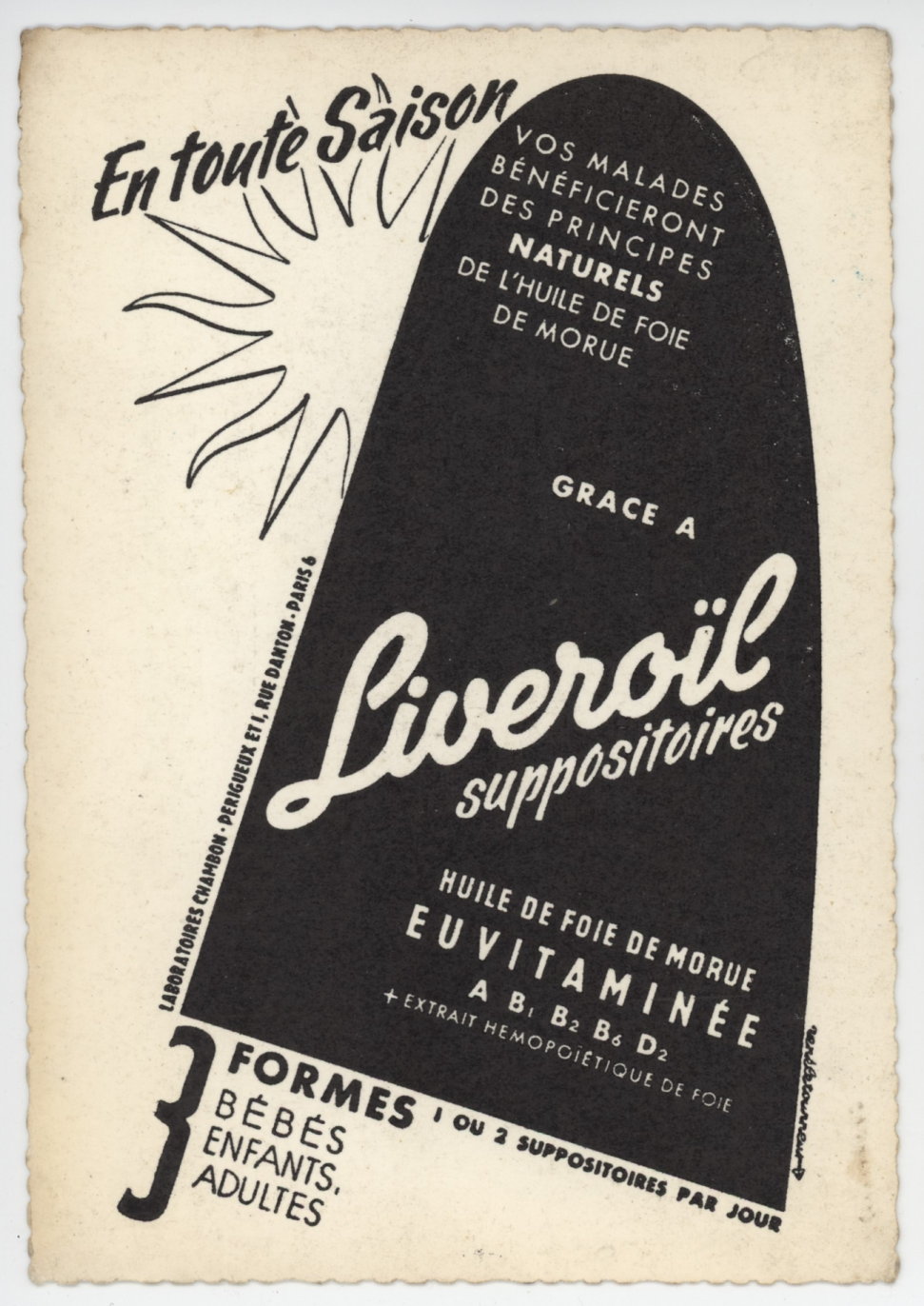 Frankreich » Liveroïl « Werbekarten aus den 1930er Jahren für „Liveroïl”, einem natürlichen Lebertran-Extrakt in Zäpfchenform oder als Tropfen zur Gesunderhaltung von Babys, Kindern und Erwachsenen.