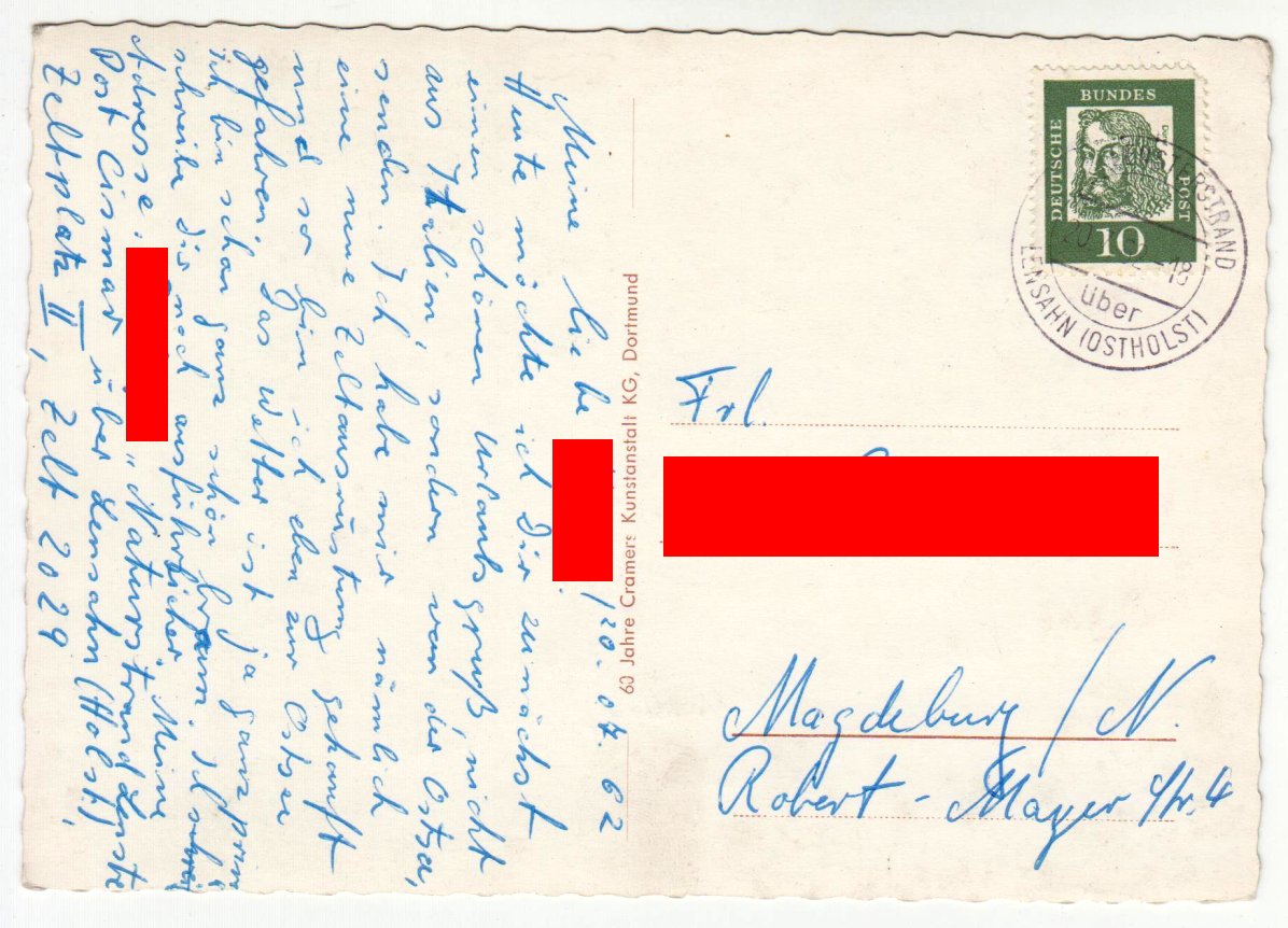 Postkarte → Ostsee » Feriengrüße von der Ostsee « Geschrieben am Naturistenstrand Lenste am 20. Juli 1962