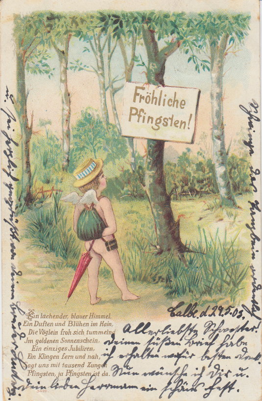 Postkarte Fröhliche Pfingsten Grußkarte aus dem Jahr 1903 - gelaufen, Stempel vom 29. und 30. Mai 1903
