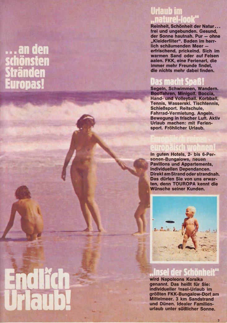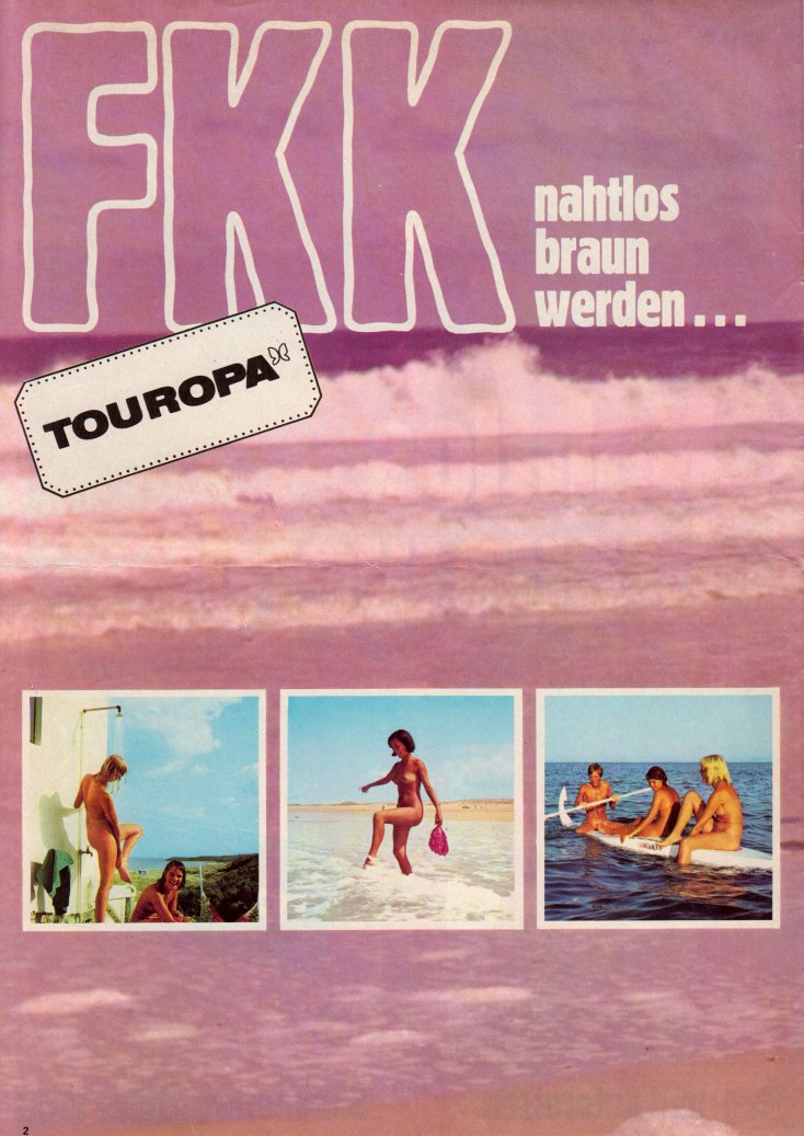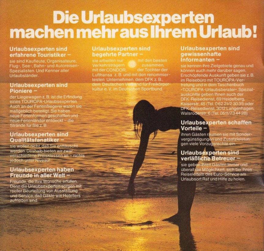 Sommerbroschüre aus dem Jahr 1969 des Reiseveranstalters Touropa. Heute kaum zu glauben, aber im Jahr 1969 durfte dieser Prospekt nicht öffentlich in den Reisebüros ausliegen. Er wurde auf Nachfrage von Erwachsenen nur „unter dem Ladentisch” herausgegeben.