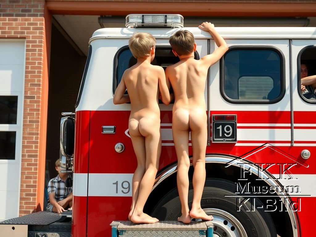 ◀ Zwei Jungen, die ein Feuerwehrauto begutachten. Abgesehen davon, dass es eigentlich ein deutscher Feuerwehrwagen sein sollte, hat das Programm mit gewissen Rundungen immer wieder so seine Schwierigkeiten. |