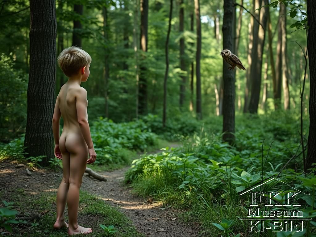 ◀ So weit, so gut ... wie der Kleine Junge da so nackt im Wald steht, vom Ergebnis her ganz gut, allerdings sollte er eine Eule beobachten, doch diese „hängt” da irgendwie in der Luft. |