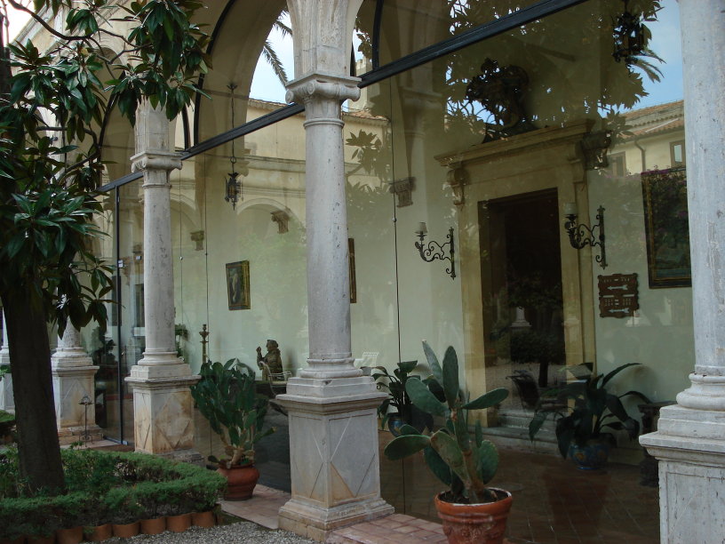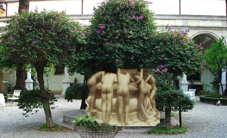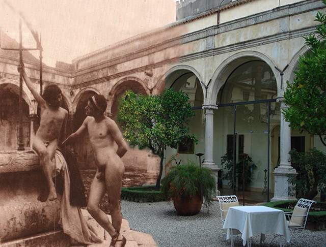 Fotomontagen → © Giovanni Dall'Orto Wilhelm von Gloeden erstellte einige seiner Aufnahmen im Kreuzgang des Klosters von Taormina. Heute beherbergen die historischen Mauern des ehemaligen Kloster aus dem 14. Jahrhundert ein Luxus-Hotel. Selbst die Originalfresken sind noch erhalten. Vom Hotel aus blickt man auf das Ionische Meer. Es ist 2 km vom Strand Isola Bella, 55 km vom Ätna und 68 km vom Flughafen Catania entfernt. Giovanni Dall'Orto erstellte seine Aufnahmen im September 2006 |