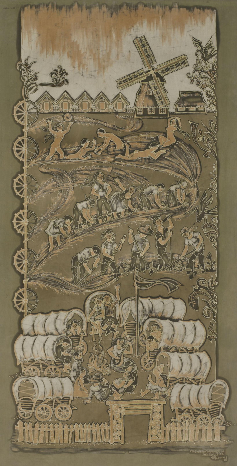 Elisabeth Hohensee wurde durch ihren Sohn zu dieser bildlichen Darstellung Mecklenburgs angeregt, der als Agrar-Ingenieur in Groß-Stieten tätig war und von den damals in der DDR stattfindenden „Studentenlager für Arbeit und Erholung” berichtete.