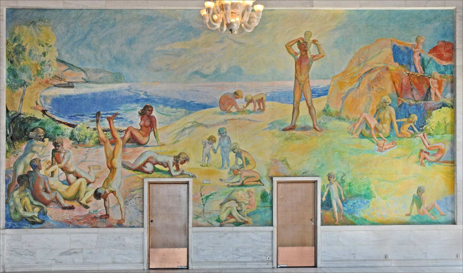 Ein beeindruckendes Wandgemälde mit einer Szene aus der Freikörperkultur befindet sich im Eingangsbereich des Rathauses von Oslo.