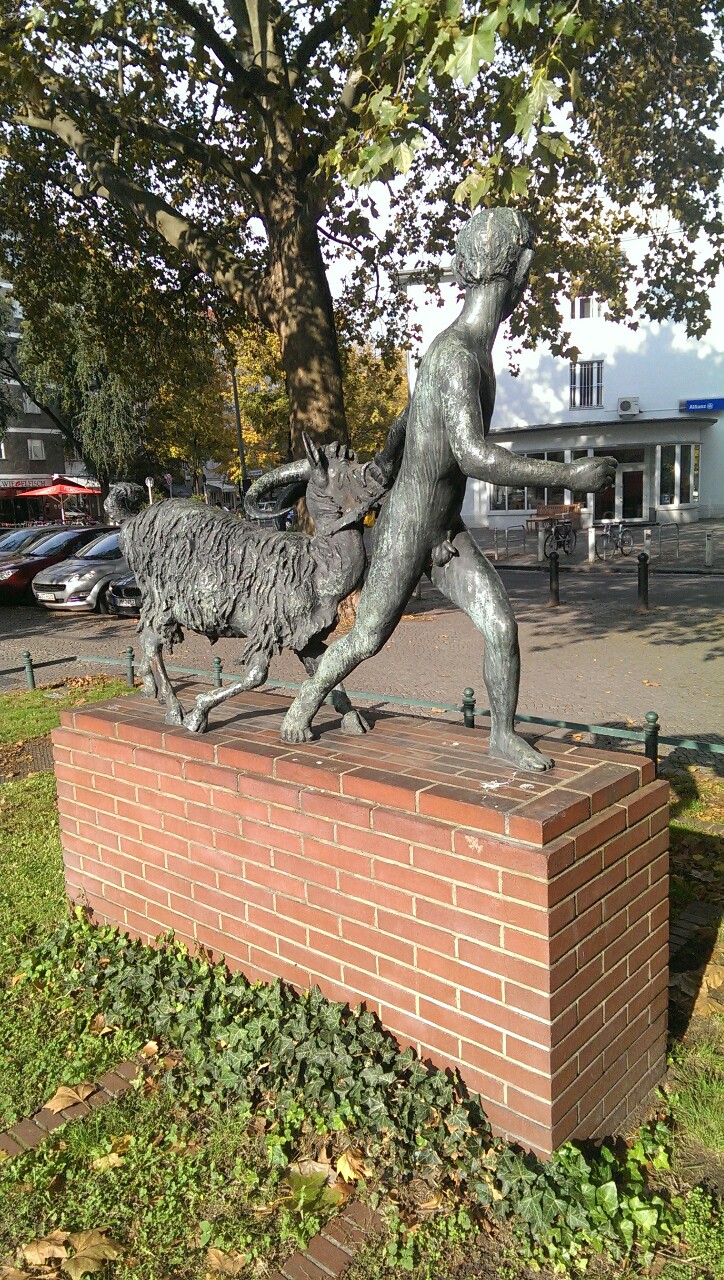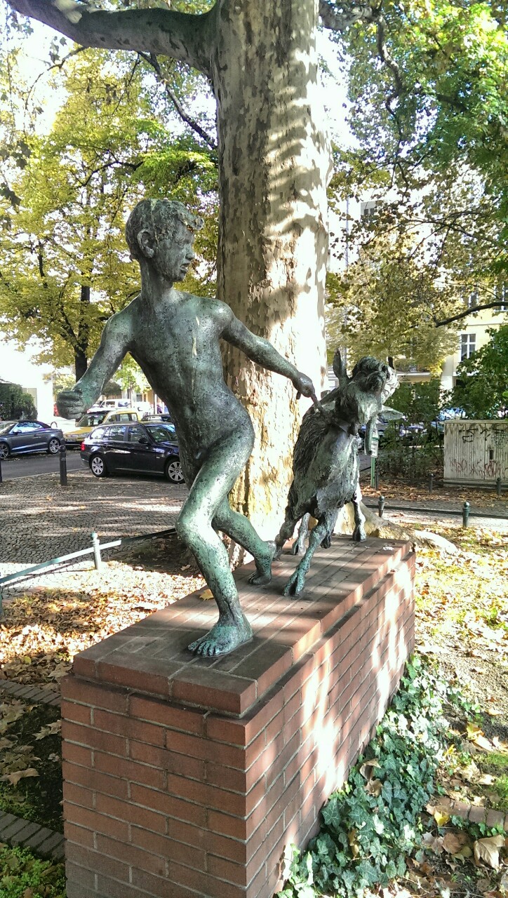 Die Bronze-Skulptur „Knabe mit Ziege” steht auf dem Savignyplatz in Berlin.