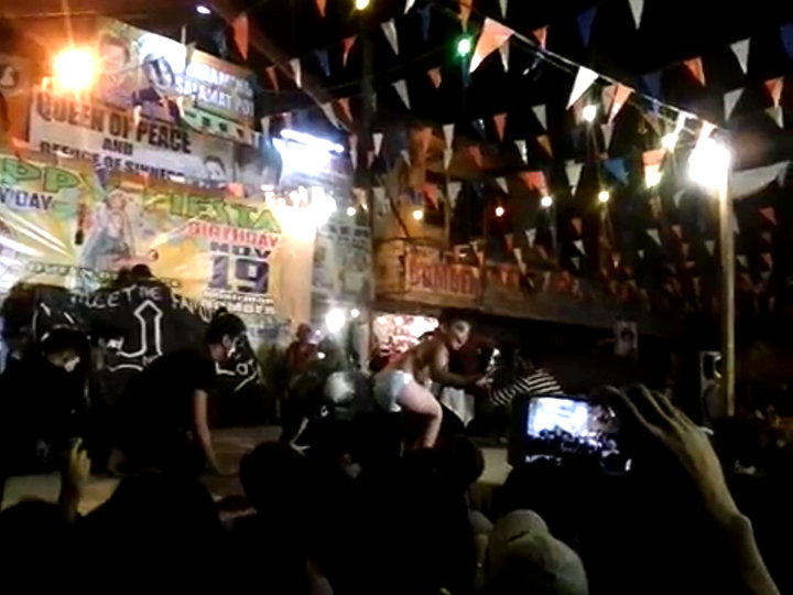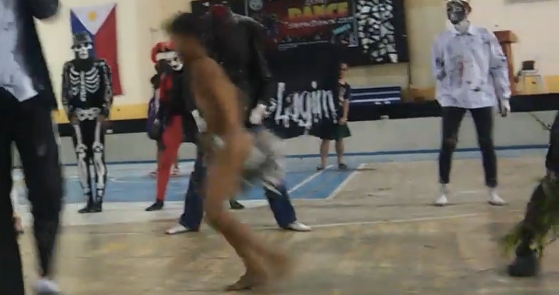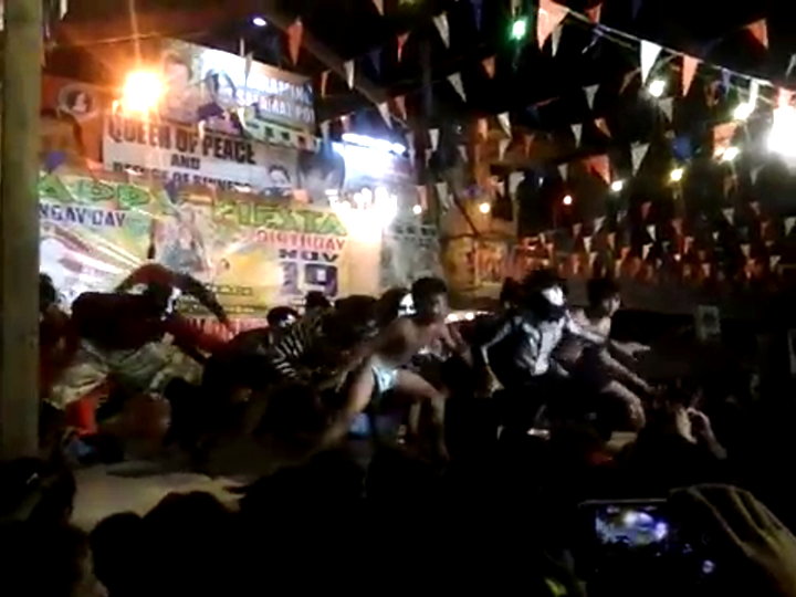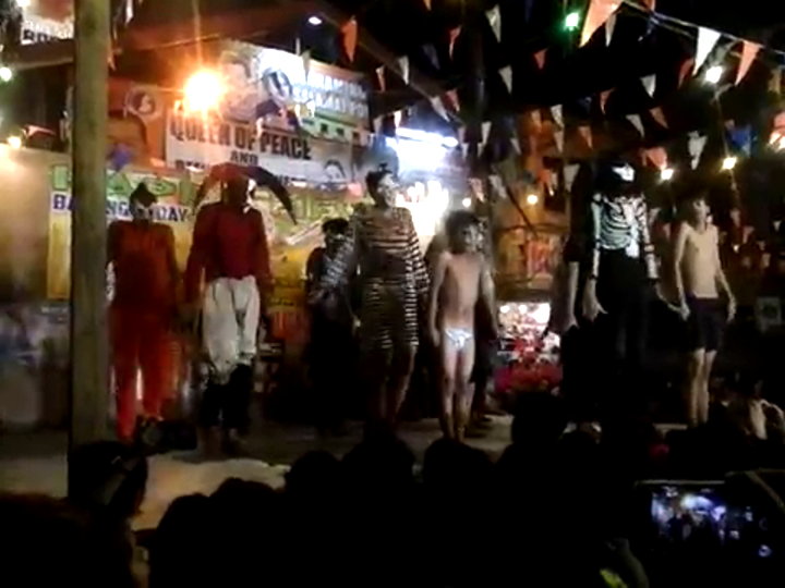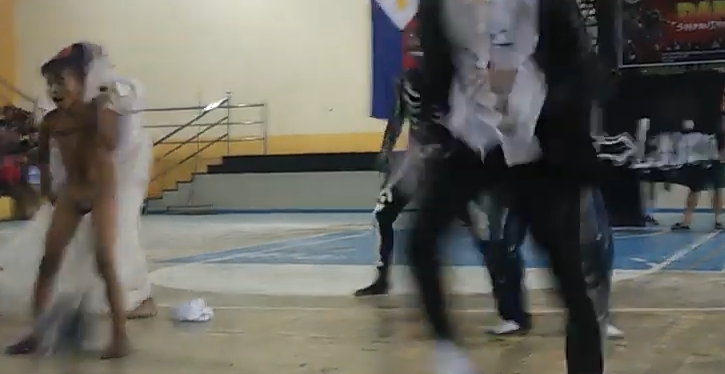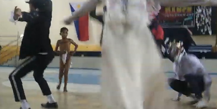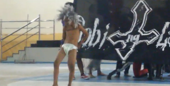 ... in einer Turnhalle. Besonders beim „verlieren” der Windel gibt es immer wieder kleine Probleme. Die Windel wird dann unter lautem Gejohle in das Publikum gewworfen - nun, komplett nackt, macht der Junge noch ein paar „Flip-Flops” über die Bühne und verschwindet dann hinter dem schwarzen Banner um sich eine neue Windel anzuziehen.
