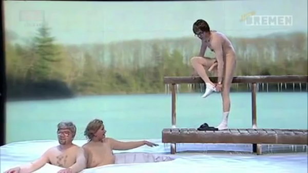 Auch, wenn die Protagonisten bekleidet sind, so zählt dieser Sketch doch eindeutig in den Bereich Naturismus.
