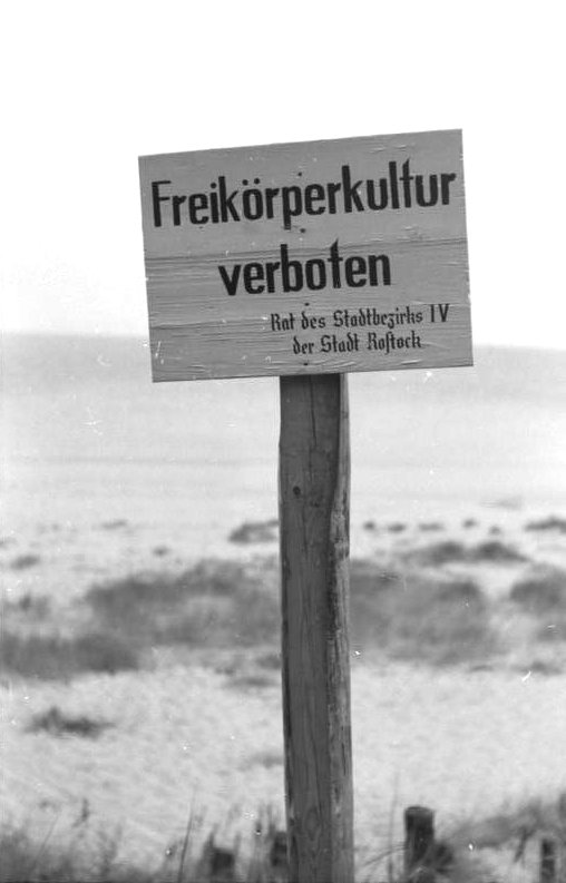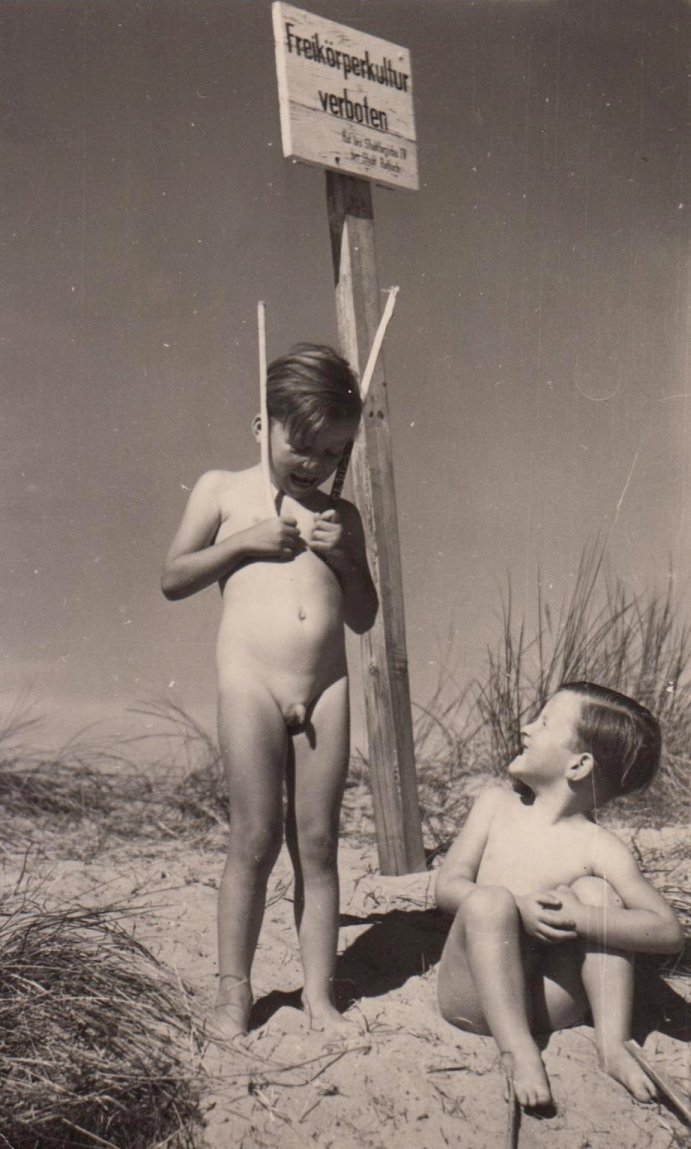 „Ungehorsam” oder einfach „clever” ? Nehmen wir es ganz genau, so befinden sich die beiden Jungen ja noch vor dem Schild. Das Verbot gilt im Grunde genommen ja auch erst ab dem Schild. Also doch kein Skandal. Wie dem auch sei, das Schild stand am Strand des Ostseebades Warnemünde, einem Ortsteil im Norden von Rostock. Das Bild von den beiden kleinen Jungen entstand in den 1950er Jahren. |