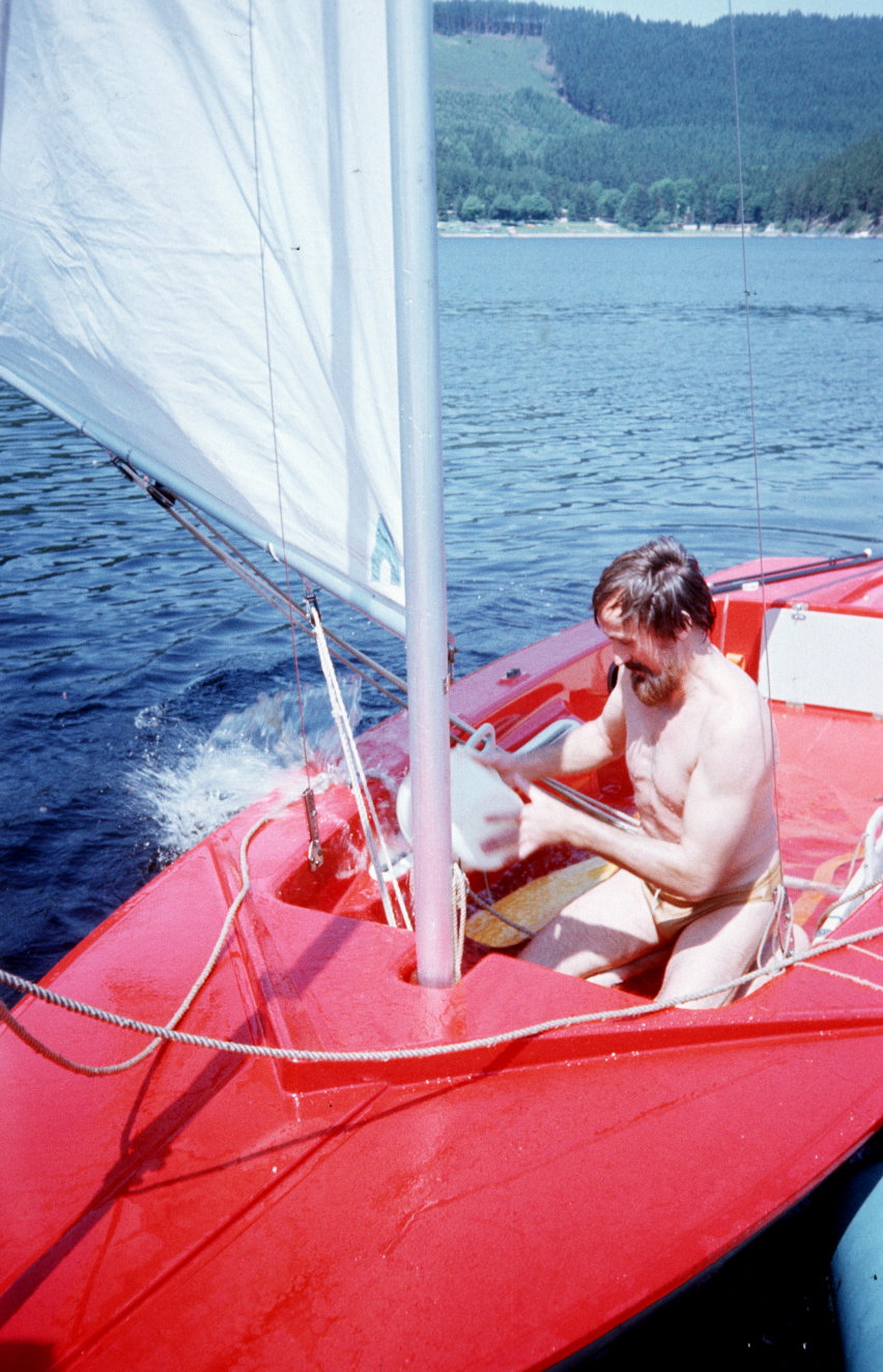 Meine Frau hatte deshalb auch einen Jogginganzug an ( und nichts darunter), wir waren ja im Urlaub. Da sahen wir wie ein Segelboot von einer plötzlichen Boe erfasst wurde und kenterte. Sofort lenkte meine Frau unser Tretboot in die Richtung und wollte helfen. Als wir an dem havarierten Boot ankamen bemühten sich schon zwei Männer (die aus dem gekenterten Boot) um das Aufrichten des Segelbootes, in dem sie sich auf das „Schwert” des Bootes stellten.
