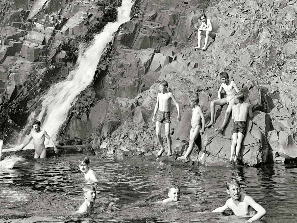 Der Lester River ist ein 30 km langer Nebenfluss des Lake Superior im Nordosten von Minnesota/USA. An mehreren Stellen des schnell strömenden Flusses gibt es kleinere Wasserfälle mit Wasserstauungen, die zum Baden einladen. Das linke Bild ist eine Aufnahme aus dem Jahr 1904. Man badete mit oder ohne Bekleidung ... und niemand störte sich daran.