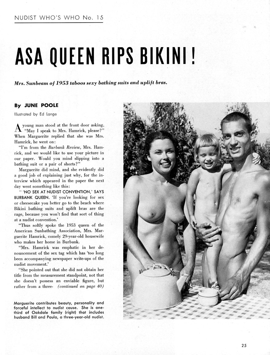 1953 wurde sie zur „Königin” der American Sunbathing Association (ASA) gekürt.