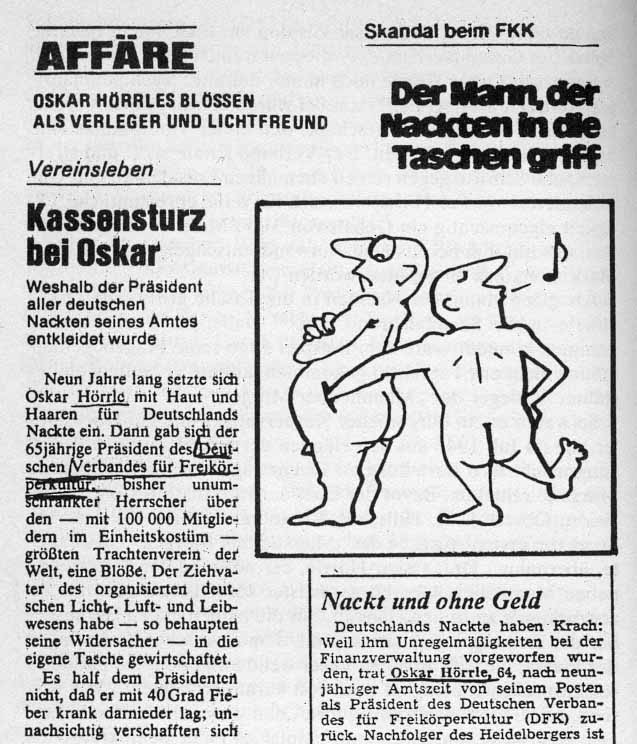 Ende 1976 stellte sich auch heraus, dass er von Reiseveranstaltern, welche u.a. auch in den FKK-Organen warben, Provisionen erhalten hatte. Weiterhin wurde nach einer Prüfung festgestellt, dass in der Vereinskasse eine halbe Million D-Mark fehlten. Er wurde daraufhin abgesetzt. In der Öffentlichkeit erlangte Oskar Hörrle als „Der Mann, der Nackten in die Tasche griff” berühmtheit.